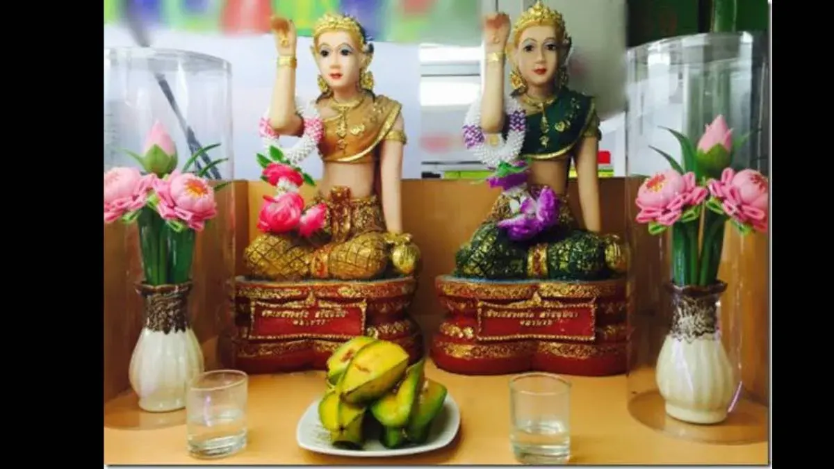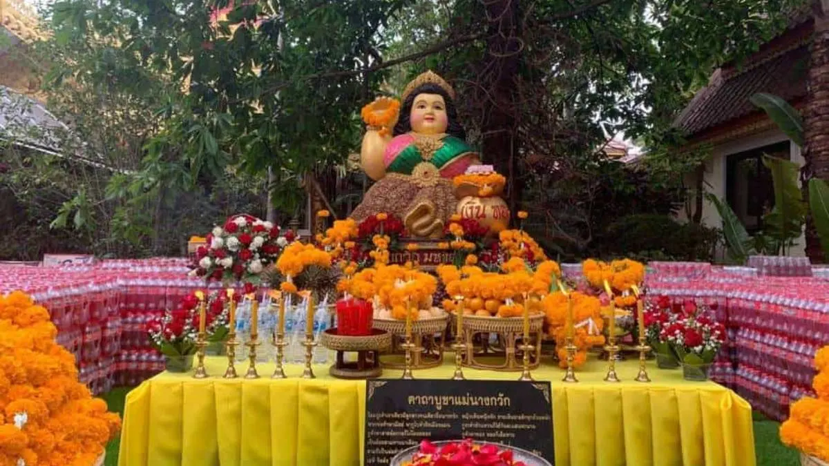 จึงเชื่อได้ว่าครอบครัวนี้มั่งคั่งด้วยพรอันประเสริฐของพระอรหันต์ทั้ง 2 รูป โดยมีจุดเริ่มต้นคือ นางสุภาวดี ผู้อธิษฐานจิตถึงพระอรหันต์ จึงเกิดเป็นรูปเคารพของนางสุภาวดี ในท่านางกวัก เป็นรูปผู้หญิงส่งยิ้ม ดวงตาดำขลับ หน้าตาละม้ายคล้ายสตรีชาวอินเดีย ในท่านั่งคุกเข่าแบบเทพธิดา พร้อมยกมือขวาทำท่ากวักมือเรียกผู้คน
