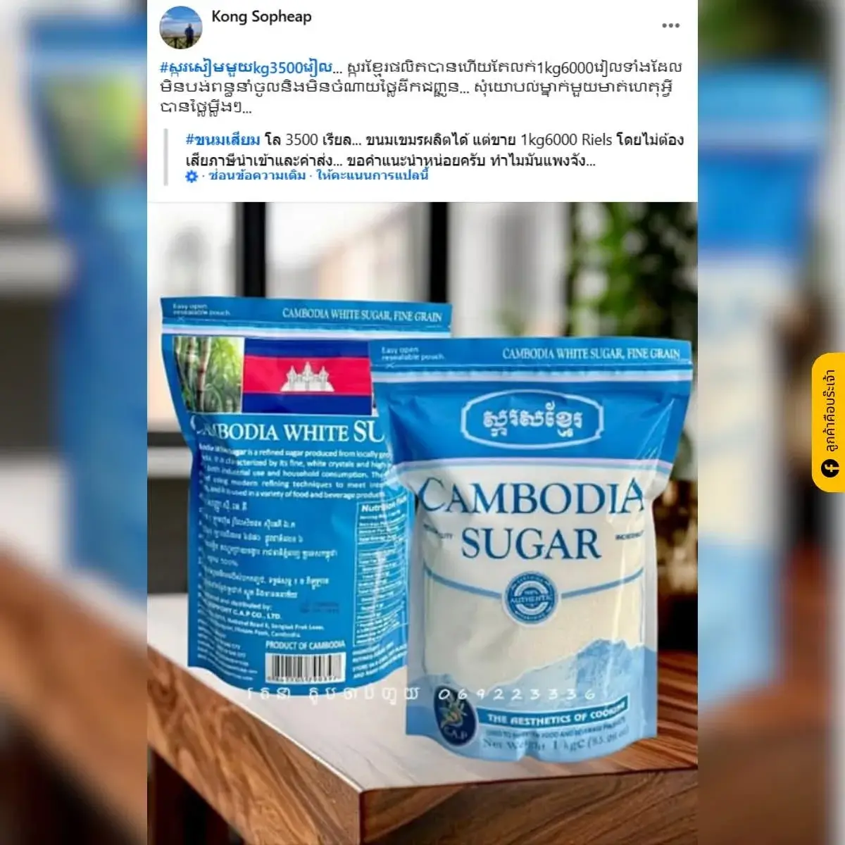 ผู้ใช้เฟซบุ๊กชาวกัมพูชารายหนึ่งโพสต์ข้อความพร้อมรูปภาพน้ำตาลสองยี่ห้อเทียบกัน พร้อมข้อความว่า
