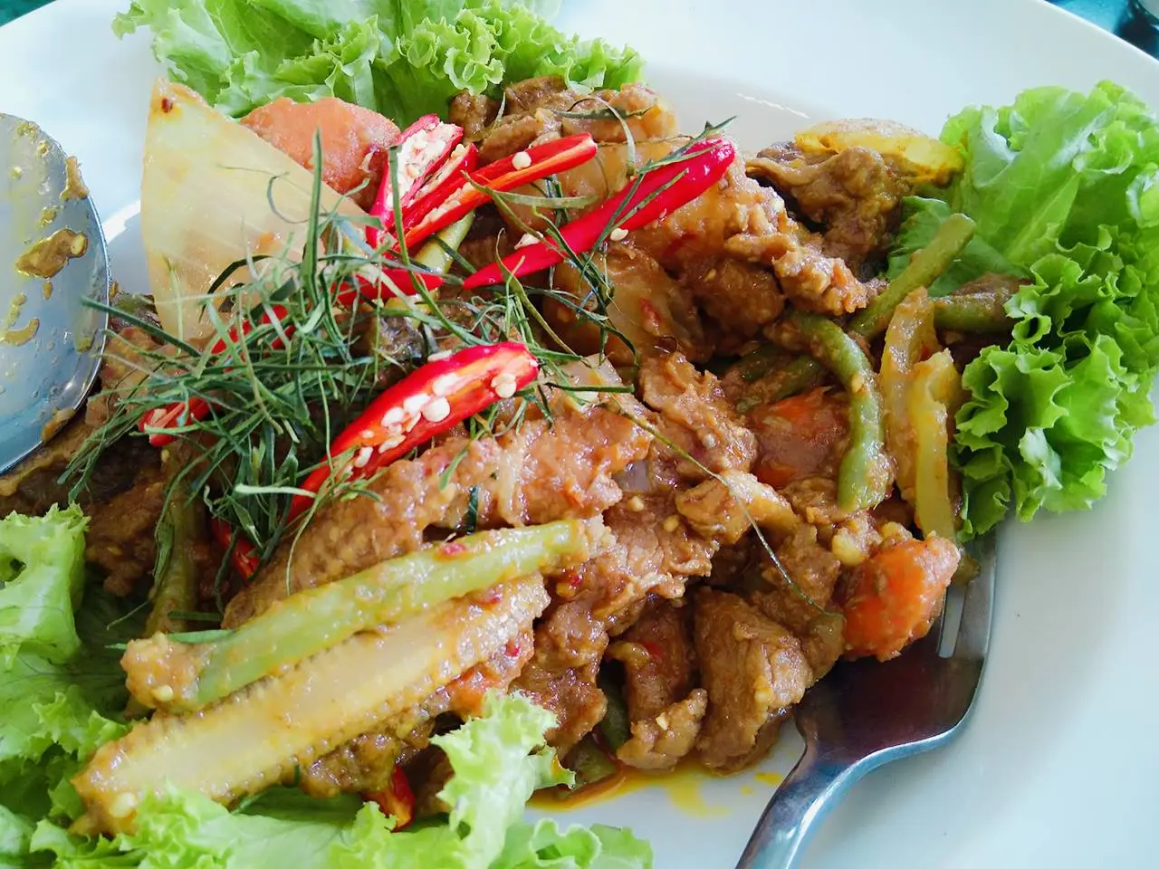 อย่างที่สองคือในส่วนของเมนู หมูผัดพริกแกง ใส่ข้าวโพดอ่อนอร่อยมาก ด้วยความที่ร้านนี้นั้นเป็นร้านที่ไม่ค่อยที่จะหวงเครื่อง อร่อยและกลมกล่อมมาก ยิ่งทานยิ่งอร่อย เขาถึงบอกว่าการที่เรานั้นจะทานอาหารนั้นหากว่าเรานั้นทานเพียงจานแรกนั้นอร่อยไม่ต้องสั่งมาอีกจานเพราะว่าจะทำให้จานนั้นจะไม่อร่อย