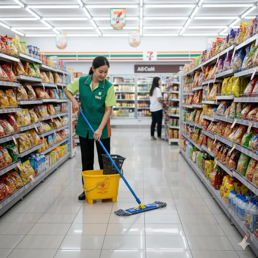 7.เคลียร์ผลัด จะแบ่งกันๆ ทั้งเติมของฟร้อนของคือเอาของมาไว้ข้างหน้าให้หมดให้เชลล์เรียบร้อยสวยงามและคนฟร้อนต้องถ่ายรูปทุกล็อคส่งเป็นอัลบั้มในไลน์ บางทีต้องตักบ่อหลังร้านอันนี้เหม็นสุดๆแต่ต้องทำใจ ตักบ่อกุ้งที่ไม่มีกุ้ง (บ่อใต้แผงที่วางสินค้าเช่นข้าว ผักนมด้านล่างถ้าเครื่องจักรดังมากต้องยกของออกแล้วตักน้ำออกไปเททิ้ง) ล้างห้องน้ำ เปลี่ยนถังขยะทั้งข้างในเคาท์เตอร์ ใต้ตู้กดน้ำ หน้าร้าน หลังร้านใหม่ให้หมด กวาด เช็ดถูให้เรียบร้อย และถ่ายรูปทุกสิ่งที่ทำส่งในไลน์ เรียกว่า ส่งผลัดกลับบ้าน