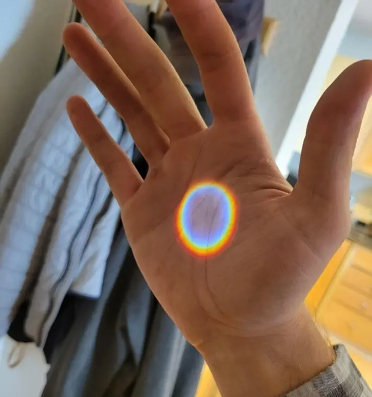 10. ในช่วงฤดูร้อน ดวงอาทิตย์จะเรียงตัวตรงกับช่องมองประตูของฉัน แสงที่ส่องรอดลงมาทำให้เกิดรุ้งกินน้ำวงเล็ก ๆ นี้