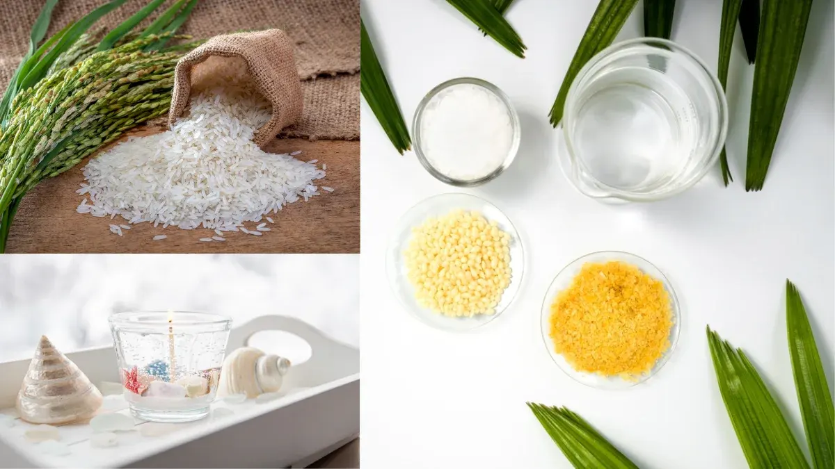5.ไขข้าวหอมมะลิ (Jasmine Rice Wax) มีกลิ่นหอมอ่อน ๆ ของข้าวหอมมะลิ มีคุณสมบัติการเผาไหม้ที่สะอาด ไม่สร้างเขม่า ปลอดภัย เป็นมิตรกับสิ่งแวดล้อม สามารถนำไปใช้เป็นส่วนผสมในเครื่องหอมอื่น ๆ ได้