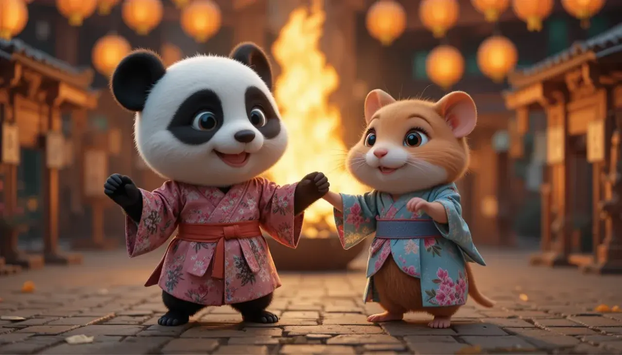เมื่อไฟโคมสว่างไสวและหิมะโปรยปราย บรรยากาศในงานเต็มไปด้วยความอบอุ่นจากเสียงหัวเราะและเสียงดนตรีญี่ปุ่น ทั้งคู่ตั้งใจทำทาโกะยากิร้อน ๆ ให้เพื่อนสัตว์ต่าง ๆ ได้ลิ้มลอง ไม่ว่าจะเป็นแรคคูน กระต่าย แฮมสเตอร์ กระรอก และหมีแพนด้า ทุกตัวต่างเข้ามาร่วมสนุกกับกิจกรรมงานวัดสุดคึกคัก