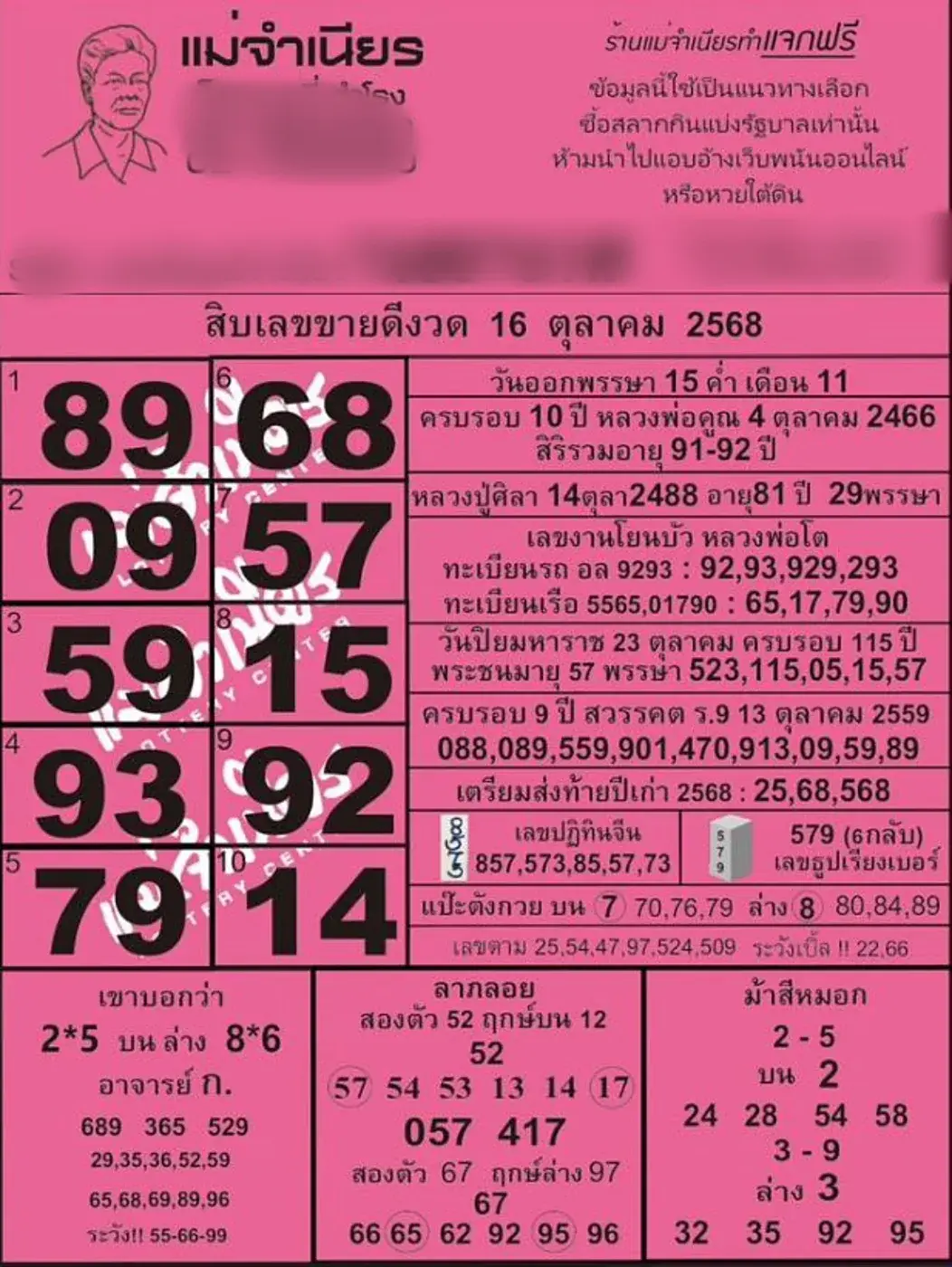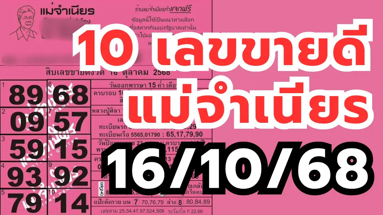 สิบเลขขายดีแม่จำเนียร งวด 16/10/68