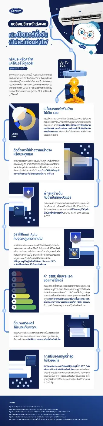 อากาศร้อนๆ ในบ้านเราแบบนี้ คนส่วนใหญ่ก็คงขาดแอร์ไม่ได้แม้ว่ามันจะทำให้ค่าไฟพุ่งขึ้นมาก็ตาม ถึงการเปิดแอร์จะช่วยให้เราอยู่กับอากาศร้อนได้สบายมากขึ้น สิ่งที่ตามมากลับเป็นเรื่องค่าใช้จ่ายที่หลายคนต้องกังวล แต่ไม่ต้องกลัว เพราะวิศวกรจาก Carrier มี 7 วิธีใช้แอร์ที่ช่วยประหยัดเงินในกระเป๋าได้มากกว่าขึ้นเดิมสูงสุดถึง 50% แค่ใช้งานให้ถูกวิธีตามนี้