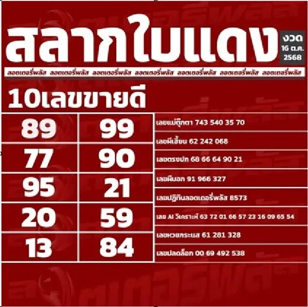 10 เลขขายดี "สลากใบแดง" งวดวันที่ 16 ตุลาคม 68..พรุ่งนี้รวย คอหวยส่องด่วน!!