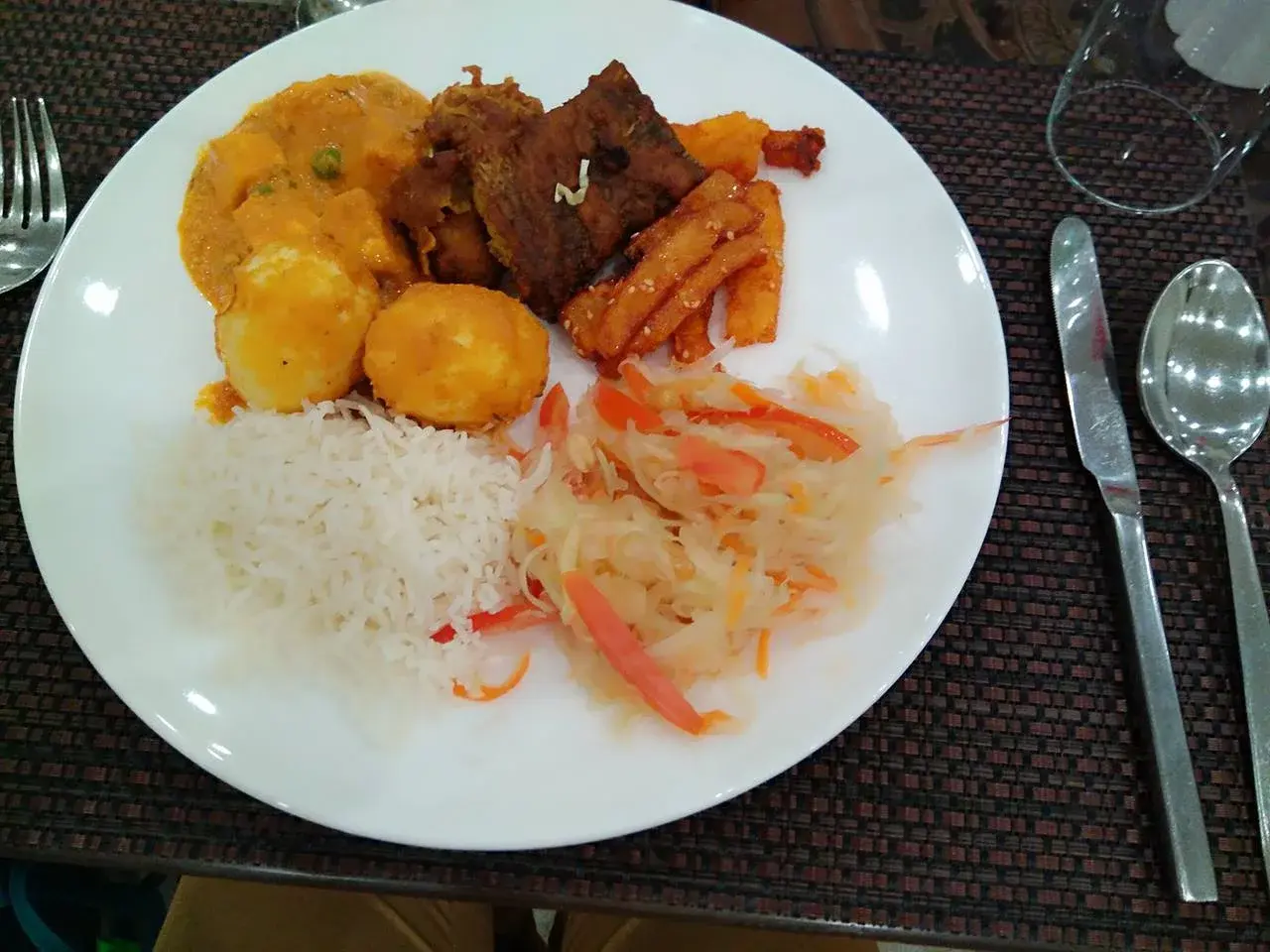 อาหารเช้าจานนี้นั้นสิ่งที่เรานั้นเลือกเพื่อที่จะชิมนั้นคือข้าวสาลีที่เม็ดเล็กน่าอร่อยมาก นุ่มมากกว่าข้าวไทยเพราะว่าในส่วนของเมล็ดนั้นเล็กแต่หากว่าจะอร่อยก็ได้เหมือนกัน แต่จะไม่ค่อยอ้วนเหมือนบ้านเรา ต่อมาสิ่งที่เรานั้นเลือกคือปลาทอด และในส่วนของไข่ที่เหมือนไข่ลูกเขยแต่ว่าไม่ใช่ และสุดท้ายที่เรานั้นเลือกที่จะตักคือแกงกะหรี่ที่มีความเหมือนแกงเผ็ดบ้านเรา