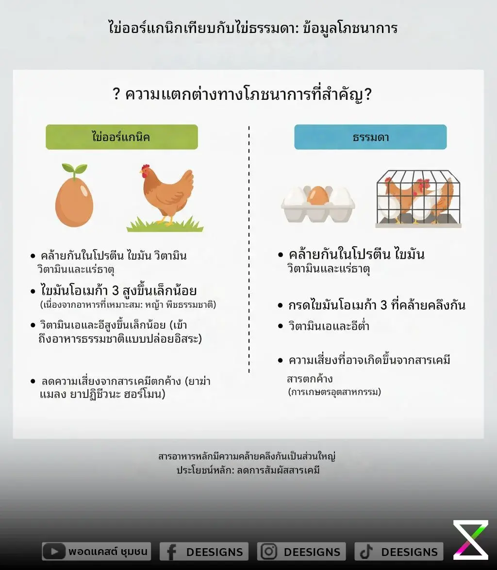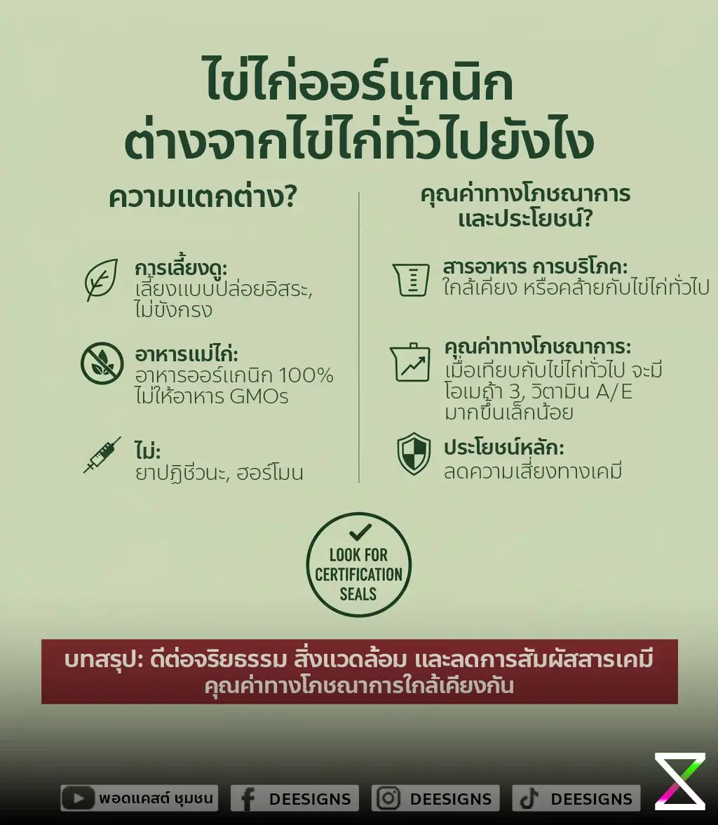 การเลือกซื้อไข่ไก่ออร์แกนิกอย่างชาญฉลาดคือการ มองหาเครื่องหมายรับรองอินทรีย์ที่น่าเชื่อถือ และทำความเข้าใจความหมายของคำศัพท์ต่างๆ บนฉลาก. การจ่ายในราคาที่สูงขึ้นสำหรับไข่ไก่ออร์แกนิกเป็นการลงทุนในเรื่องความปลอดภัยของอาหาร ความเป็นอยู่ที่ดีของสัตว์ และการสนับสนุนระบบเกษตรกรรมที่เป็นมิตรต่อสิ่งแวดล้อม. ดังนั้น คำตอบว่า "ดีจริง หรือแค่การตลาด" อาจขึ้นอยู่กับคุณค่าที่คุณให้ความสำคัญ แต่จากข้อมูลทางวิทยาศาสตร์ ไข่ไก่ออร์แกนิกมีข้อดีที่จับต้องได้ในเรื่องความสะอาดและปลอดภัยจากสารเคมี