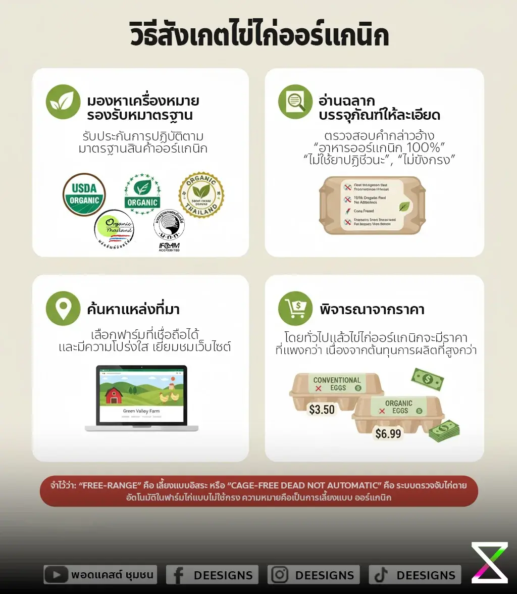 ข้อควรจำ: "Free-Range" หรือ "Cage-Free" ไม่ได้หมายความว่าเป็น "Organic" เสมอไป ไข่ออร์แกนิกจะต้องมีมาตรฐานที่สูงกว่าในเรื่องของอาหารที่ไก่กินและข้อจำกัดในการใช้สารเคมี