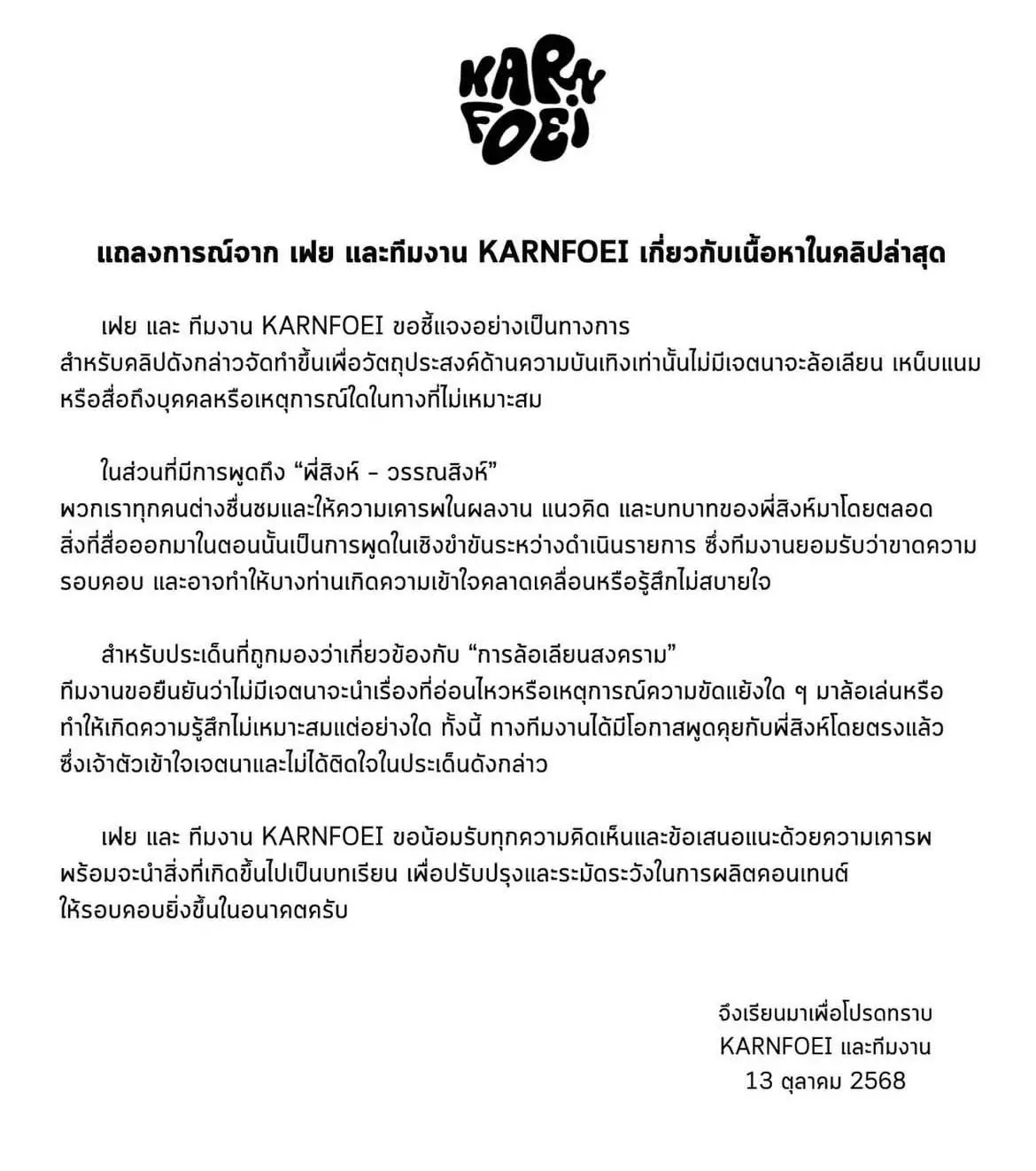 ล่าสุด เฟย และทีมงาน KARNFOEI ได้ออกแถลงการณ์จากเกี่ยวกับเนื้อหาในคลิปที่เป็นประเด็นแล้ว ยืนยันไม่มีเจตนาจะล้อเลียน เหน็บแนม หรือสื่อถึงบุคคล หรือเหตุการณ์ได้ในทางที่ไม่เหมาะสม