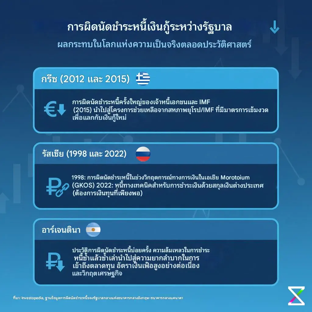 รัสเซีย (Russia, 1998 และ 2022): รัสเซียผิดนัดชำระหนี้ครั้งใหญ่ในปี 1998 ในช่วงวิกฤตการเงินเอเชีย โดยการประกาศพักชำระหนี้ (Moratorium) ต่อพันธบัตรรัฐบาล (GKOs) และใน ปี 2022 รัสเซียถูกประกาศให้เกิดการผิดนัดชำระหนี้ต่างประเทศทางเทคนิค (Technical Default) เนื่องจากมาตรการคว่ำบาตรทำให้ไม่สามารถชำระหนี้เป็นเงินสกุลต่างประเทศได้ แม้ว่าจะมีเงินทุนเพียงพอ (Source: Investopedia, Bank of England-BoC Sovereign Default Database)
