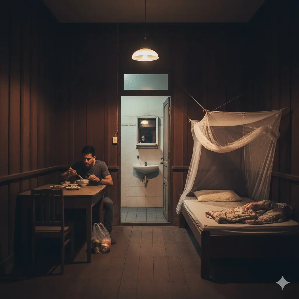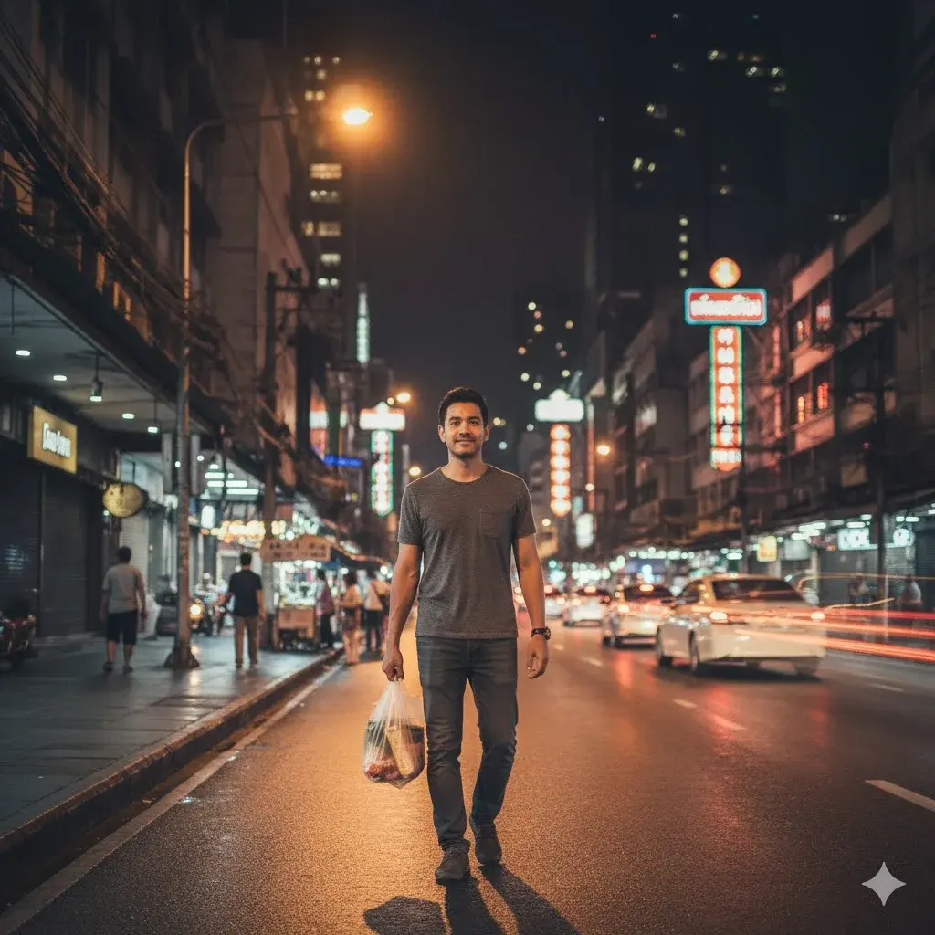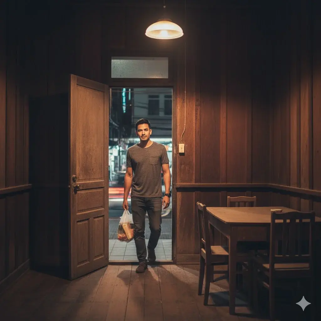 ตอนค่ำ เดินกลับห้องผ่านแสงไฟถนนที่เริ่มมืดลง เห็นคนเดินคู่กันหัวเราะกัน แล้วเราก็ได้แต่มองผ่านกระจกฝั่งตรงข้าม คิดในใจว่า “ถ้ามีใครสักคนรออยู่ที่ห้องก็คงดี” แต่พอเข้าห้องมาจริงๆ ก็พบกับความเงียบ ความเหงา และความจริงที่ต้องอยู่กับมัน