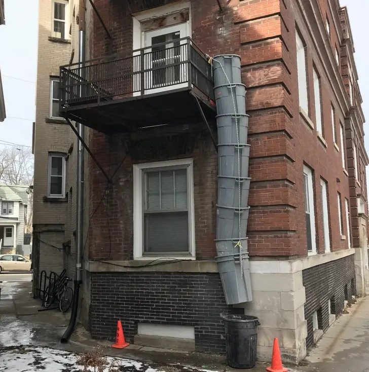 13. อาคารหลังนี้มีรางทิ้งขยะที่ทำจากถังขยะ