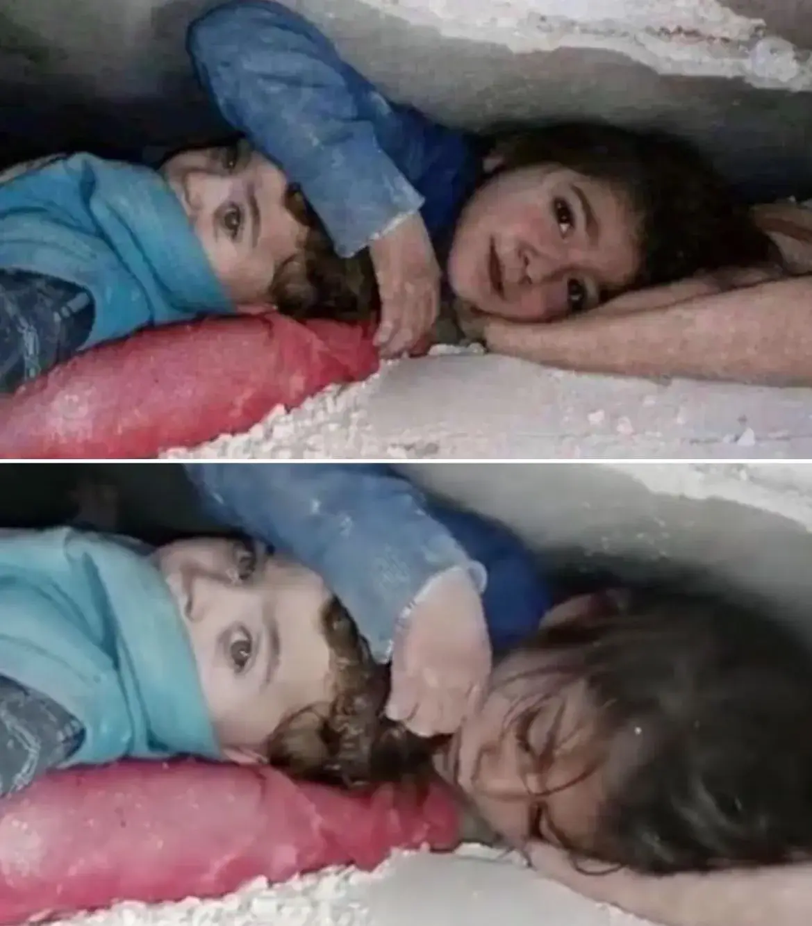 ภาพของเด็กหญิงตัวเล็กที่ใช้แขนบังหัวน้อง กลายเป็นไวรัลที่ถูกแชร์ไปทั่วโลก เธอได้รับการขนานนามว่า “ฮีโร่ตัวน้อยแห่งซีเรีย”