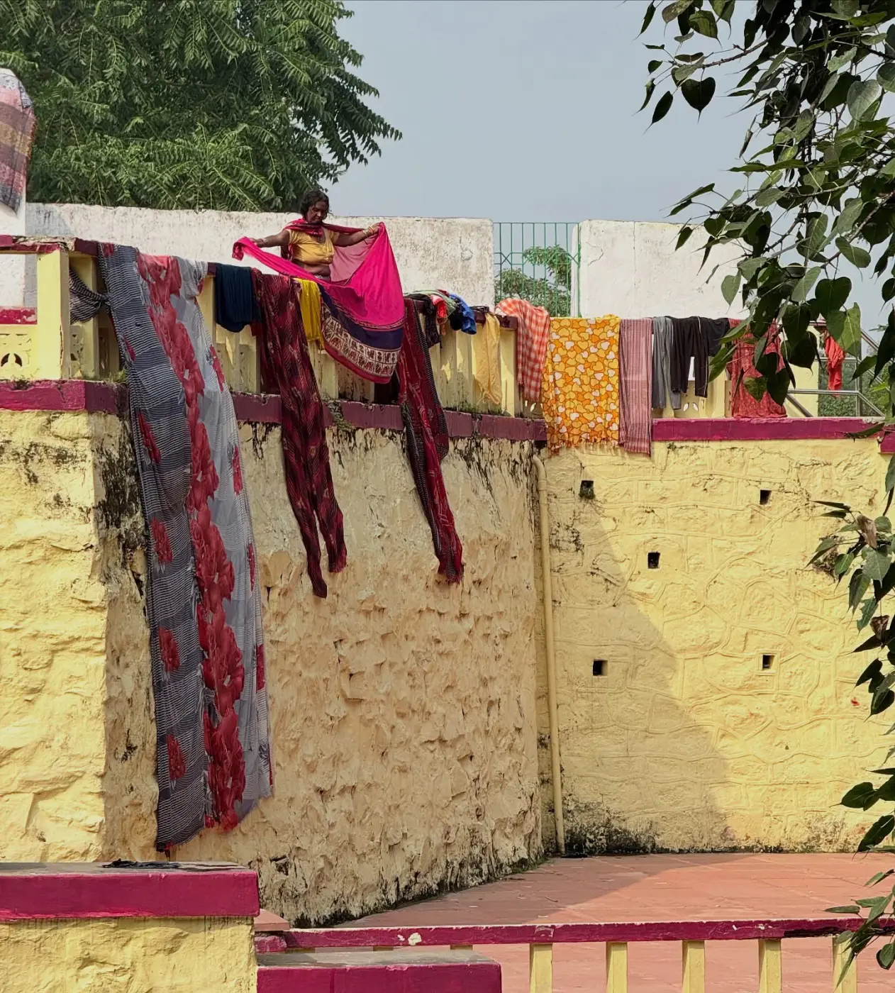 คุณยายที่ตากผ้าอยู่นั้นเห็นเราตั้งกล้องถึงกับโบกมือให้แล้วบอกกับเรานั้นว่า อะไรสักอย่างแต่ยิ้มให้ เรานั้นถือว่าเป็นพลังบวก แดดแม้จะร้อนระอุแต่ผ้าของอินเดียนั้นช่วยระบายอากาศได้ดีมาก ไม่ร้อนและนิ่มมากเวลาที่เรานั้นนำมาพันคอ แม้อากาศจะหนาวเพียงใด สุขใจเมื่อมีผ้าพันคลุม
