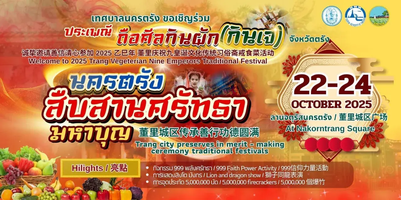 เทศบาลนครตรัง ขอเชิญชวนพี่น้องประชาชนชาวตรังและนักท่องเที่ยว ร่วมเป็นส่วนหนึ่งแห่งพลังศรัทธา ในการสืบสาน ประเพณีถือศีลกินผัก (เทศกาลเจ) จังหวัดตรัง ประจำปี 2568 ซึ่งจะจัดขึ้นระหว่างวันที่ 21 – 29 ตุลาคม 2568 ณ ศาลเจ้าต่าง ๆ ทั่วจังหวัดตรัง