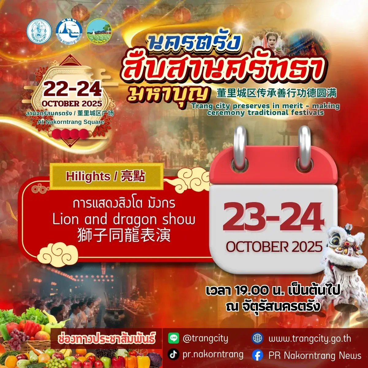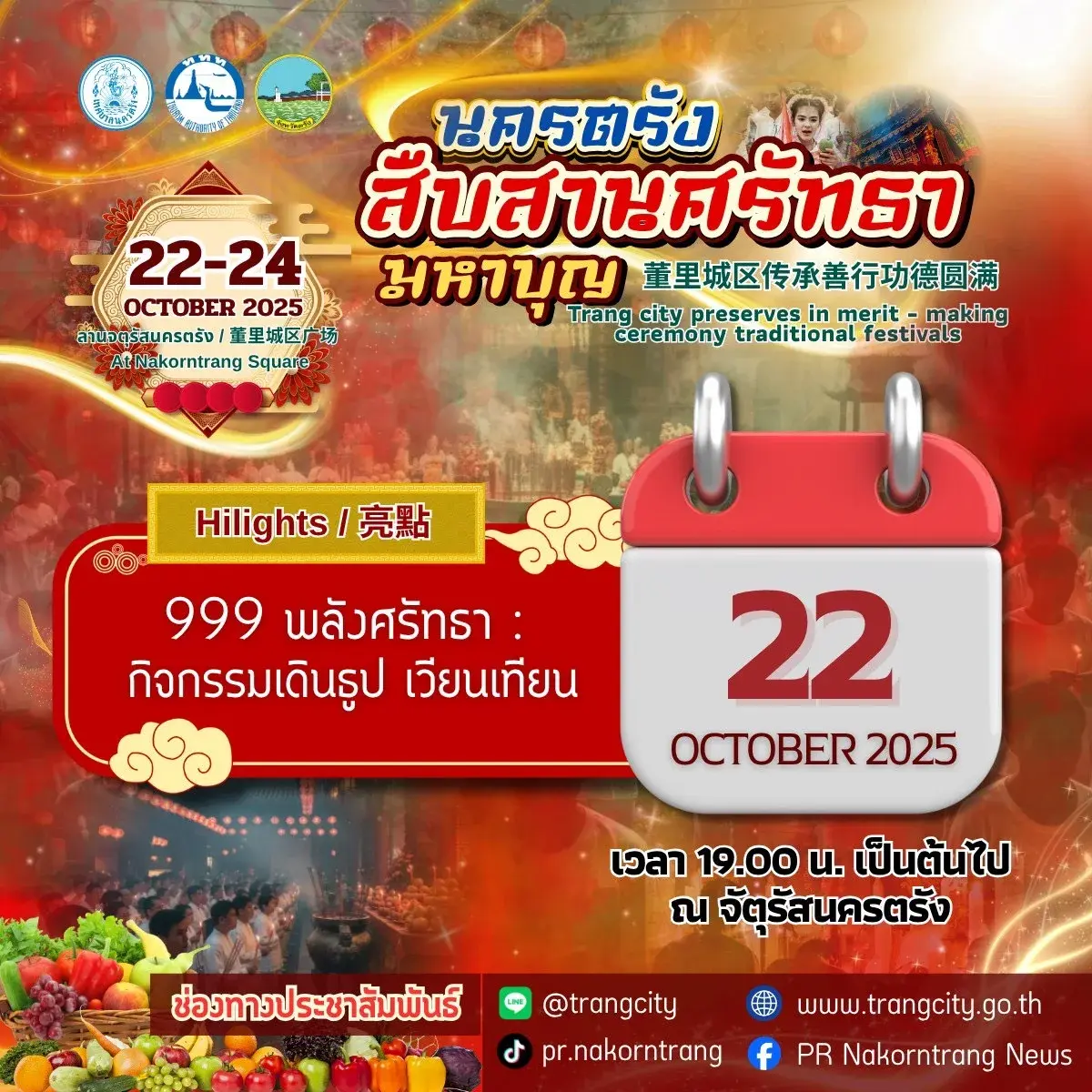 ระหว่างวันที่ 22 – 24 ตุลาคม 2568 ณ ลานจัตุรัสนครตรัง เพื่อส่งเสริมและเผยแพร่วิถีวัฒนธรรมท้องถิ่น รวมถึงสร้างความศรัทธาและความสามัคคีในชุมชน