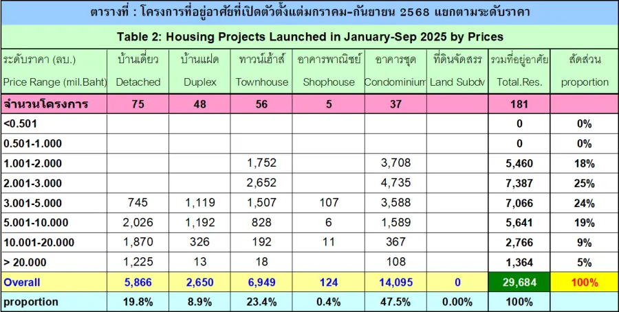 5. โดยรวมแล้วใน 9 เดือนแรกของปี 2568 เปิดบ้านเดี่ยว 5,866 หน่วย (19,8%) บ้านแฝด 2,650 หน่วย (8.9%) ทาวน์เฮาส์ 6,949 หน่วย (23.4%) และห้องชุดถึง 14,095 หน่วย (47.5%) อย่างไรก็ตามหากเทียบกับช่วงก่อนหน้านี้ห้องชุดจะเปิดประมาณ 55%-60%