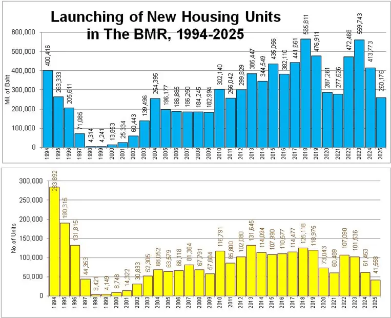 9. คาดว่าในปี 2568 โดยรวม จะมีหน่วยเปิดใหม่ทั้งหมด 41,558 หน่วย รวมมูลค่า 260,176 ล้านบาท จำนวนหน่วยลดลง 32.4% ส่วนมูลค่าลดลง 37.1% ในแง่หนึ่ง การลดลงของการเปิดตัวใหม่เป็นสิ่งที่ดีเพราะหากไม่มีการลดลง ก็คงเกิดฟองสบู่และภาวะลดตลาดในที่สุด