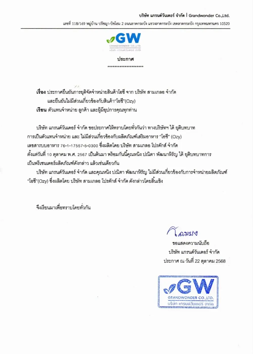 หนิงกล่าวผ่านเฟซบุ๊กว่า การตัดสินใจยุติบทบาทพรีเซ็นเตอร์เกิดจากความห่วงใยต่อผู้บริโภค และยืนยันว่าความปลอดภัยของลูกค้าเป็นสิ่งสำคัญที่สุด ขณะนี้บริษัทได้พัฒนาผลิตภัณฑ์สูตรใหม่ OZY TRIPLE S ที่ได้มาตรฐานและผ่านการรับรองจาก อย. เพื่อให้ผู้บริโภคมั่นใจในความปลอดภัย