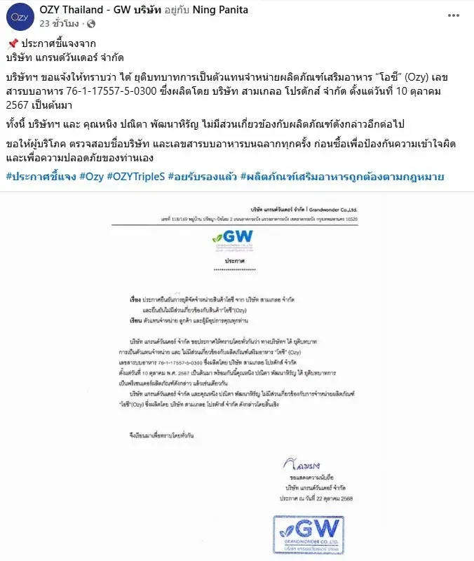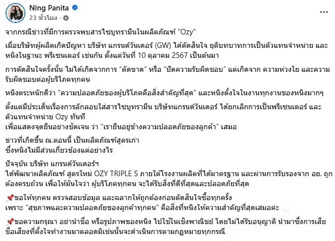 หนิง ปณิตา ประกาศยุติบทบาทพรีเซ็นเตอร์ผลิตภัณฑ์ Ozy หลังจากมีการตรวจพบสารไซบูทรามีนในผลิตภัณฑ์เสริมอาหาร ซึ่งมีผลกระทบต่อสุขภาพอย่างร้ายแรง โดยระบุว่าสูตรที่พบสารอันตรายเป็นสูตรเก่าและปัจจุบันไม่มีส่วนเกี่ยวข้องแล้ว บริษัทผู้ผลิต Ozy ได้แถลงยุติบทบาทการเป็นตัวแทนจำหน่ายตั้งแต่วันที่ 10 ตุลาคม 2567 เพื่อความปลอดภัยของผู้บริโภค
