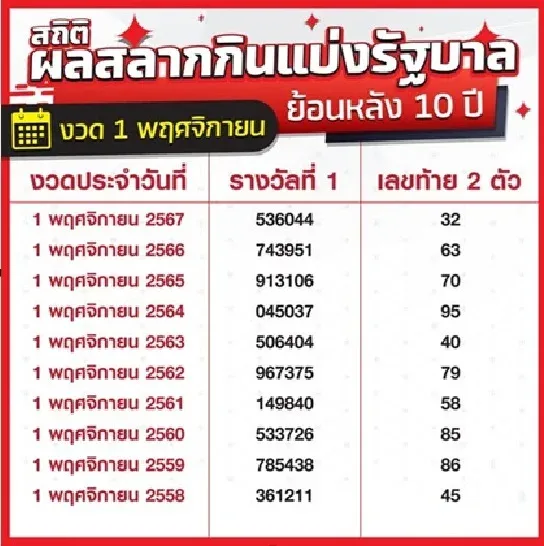 เผยสถิติการออกสลากกินแบ่งรัฐบาล ย้อนหลัง 10 ปี..งวดวันที่ 1 พฤศจิกายน 68