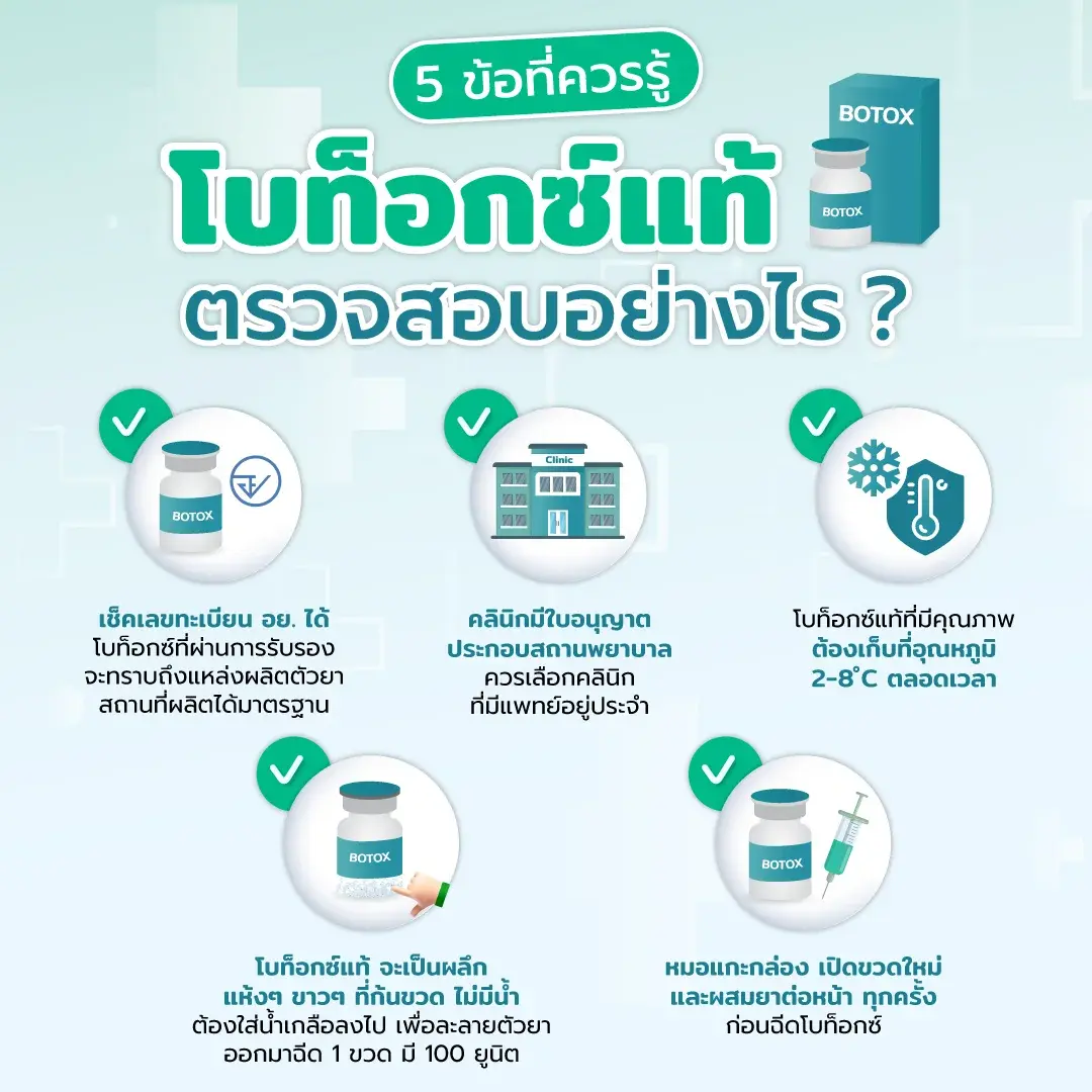 อีกสิ่งสำคัญคือ การตรวจสอบตัวยาให้มั่นใจว่าเป็นโบท็อกของแท้จริง ๆ เพราะจะช่วยให้ผลลัพธ์ออกมาปลอดภัยและอยู่ได้นาน มาดูวิธีเช็กโบท็อกแท้ง่าย ๆ กันค่ะ