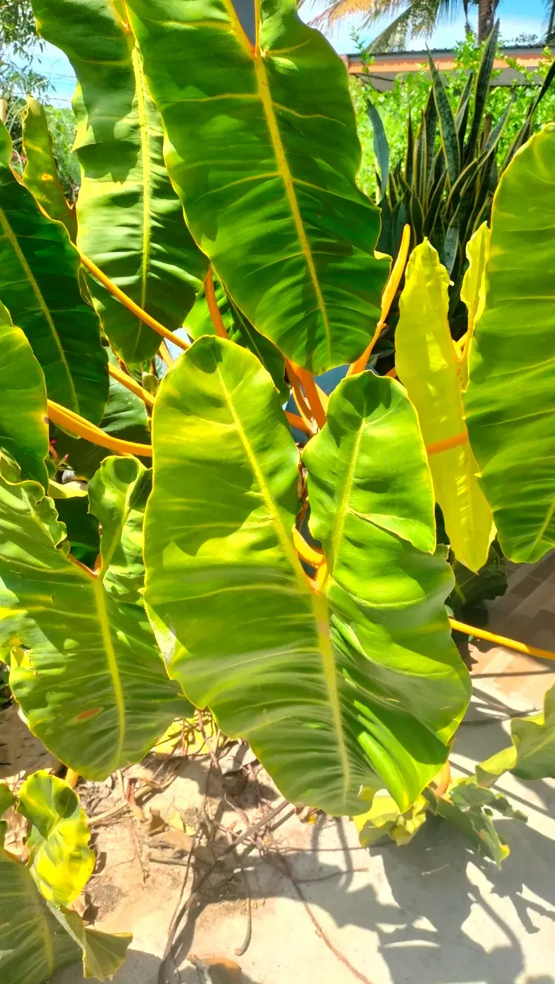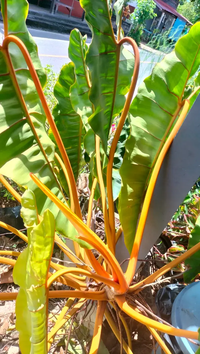 ใบใหญ่ หนาเท่าใบหน้าของคน สีเขียวอมอ่อนสุขทุกสถาน ลำต้นนั้นแข็งแรงแก่งแย่งทาง สีสันความสวยของก้านเหลืองสวยสะดุดตา
