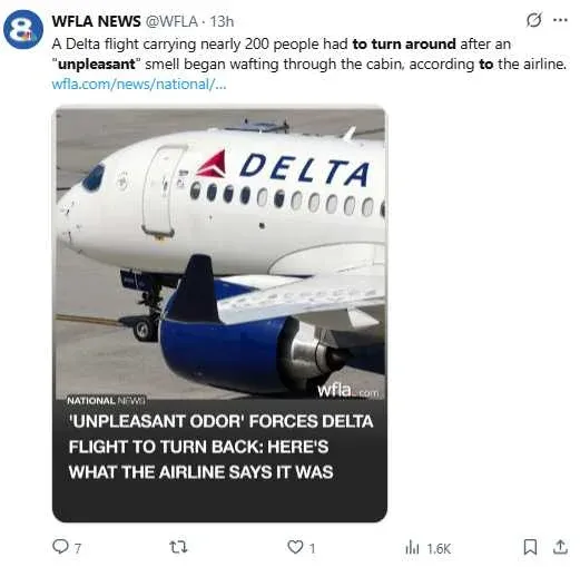 พบกลิ่นแปลกๆในห้องโดยสาร ทำให้สายการบินเดลต้าแอร์ไลน์ต้องเดินทางกลับกลางคัน