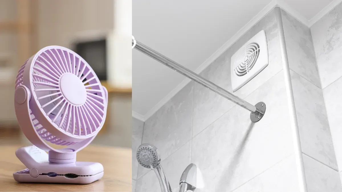 1.พัดลมขนาดเล็ก เริ่มต้นกันด้วยการแก้ปัญหาที่ปลายเหตุ โดยการถือพัดลมเล็ก ๆ เข้าไปในห้องน้ำ แต่วิธีนี้จะเหมาะกับกรณีที่ไม่สามารถปรับเปลี่ยนห้องน้ำใหม่ หรือ ติดตั้งพัดลมระบายอากาศได้ สามารถหยิบพัดลมขนาดพกพาติดมือไปเข้าห้องน้ำด้วย แม้จะไม่ช่วยระบายอากาศมากยัก แต่เป็นอีกหนึ่งตัวช่วยที่ช่วยมอบความเย็นได้ง่าย ๆ