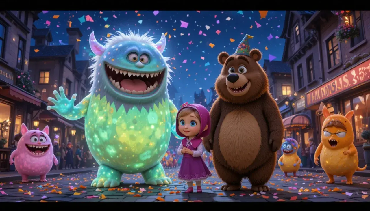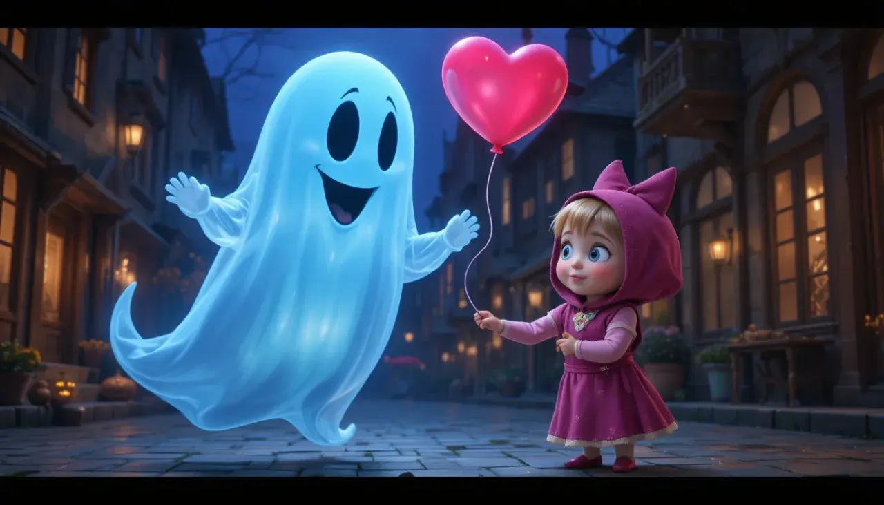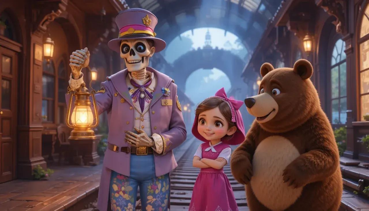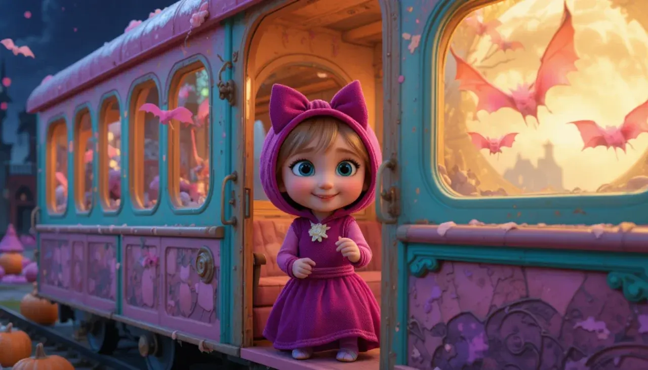ทั้งสองขึ้นรถไฟแฟนซีที่ขับโดย พนักงานโครงกระดูกสุดขี้เล่น 🚂💀 และเดินทางสู่เมืองที่เต็มไปด้วยความมหัศจรรย์ — บ้านเรือนเรืองแสง, ร้านค้าธีมผีหลากหลายแบบ, และเหล่าผีแฟนตาซีเช่น มัมมี่, Dracula, Frankenstein, ผีแม่มด, ผีไฟ, ผีหิมะ ที่ออกมาเต้นรำและขายของกันอย่างสนุกสนาน