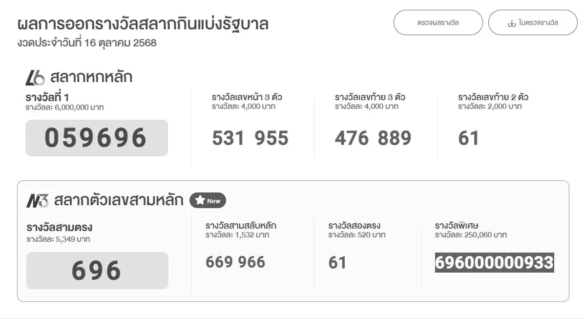 ผลการออกรางวัล สลากตัวเลขสามหลัก N3 งวดประจำวันที่ 16 ตุลาคม 2568