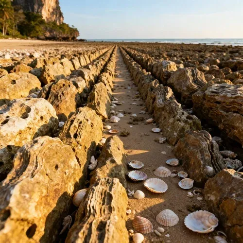 หนึ่งในสัญลักษณ์สุดแปลกตาของกระบี่ คือสุสานหอยยุคโบราณ เป็นแผ่นหินหอยปูดอายุนับล้านปีที่เรียงรายริมหาด เหมาะกับสายธรรมชาติและคนรักประวัติศาสตร์