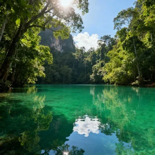 แหล่งน้ำธรรมชาติสีเขียวใส รายล้อมด้วยป่าอุดมสมบูรณ์ น้ำเย็นสบายเหมาะกับการลงเล่นหรือพักผ่อนใต้ร่มไม้ บรรยากาศบริสุทธิ์ร่มรื่นตลอดปี