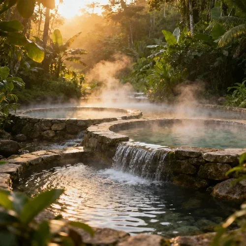 สายธารน้ำร้อนธรรมชาติ ที่ไหลเป็นขั้นบันไดท่ามกลางป่าเขา สามารถแช่ตัวคลายเมื่อยและสัมผัสความสดชื่นจากธรรมชาติรอบตัว