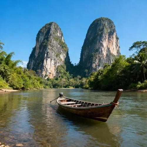 สัญลักษณ์สำคัญของกระบี่ ภูเขาคู่ขนาบริมแม่น้ำกระบี่ ที่สามารถล่องเรือชมวิวธรรมชาติ สนุกกับกิจกรรมพายเรือและชมป่าชายเลน สัมผัสความเรียบง่ายของชีวิตชาวบ้านริมฝั่ง
