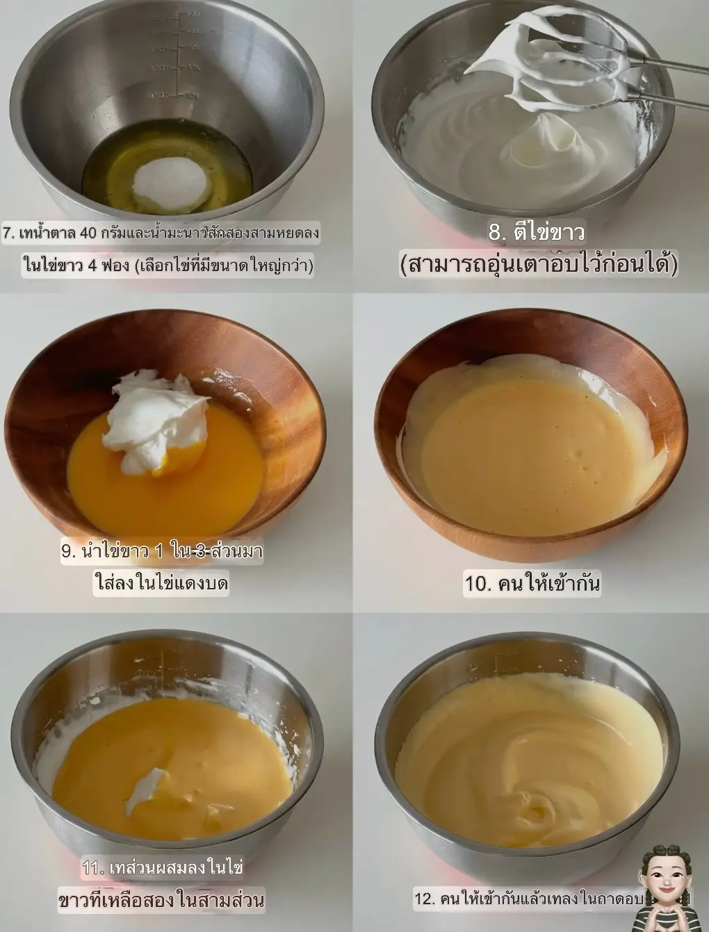 11. เทส่วนผสมลงในไข่ขาวที่เหลือสองในสามส่วน