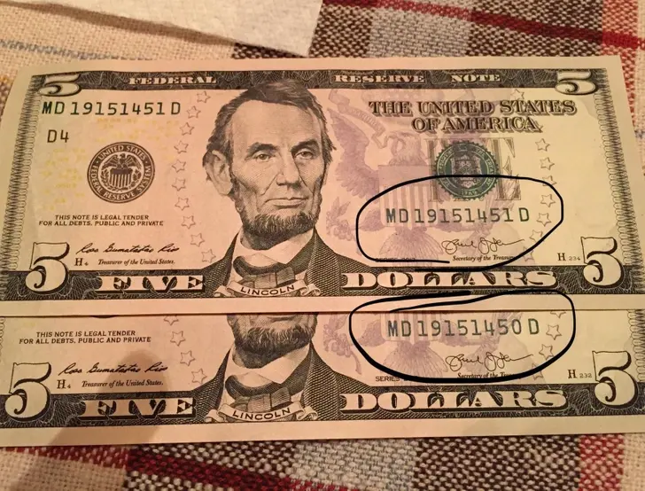 4. ฉันมีธนบัตรหมายเลขเรียงกัน โดยใบหนึ่งอยู่ในโถที่บ้านของฉัน และอีกใบมาจากแคชเชียร์