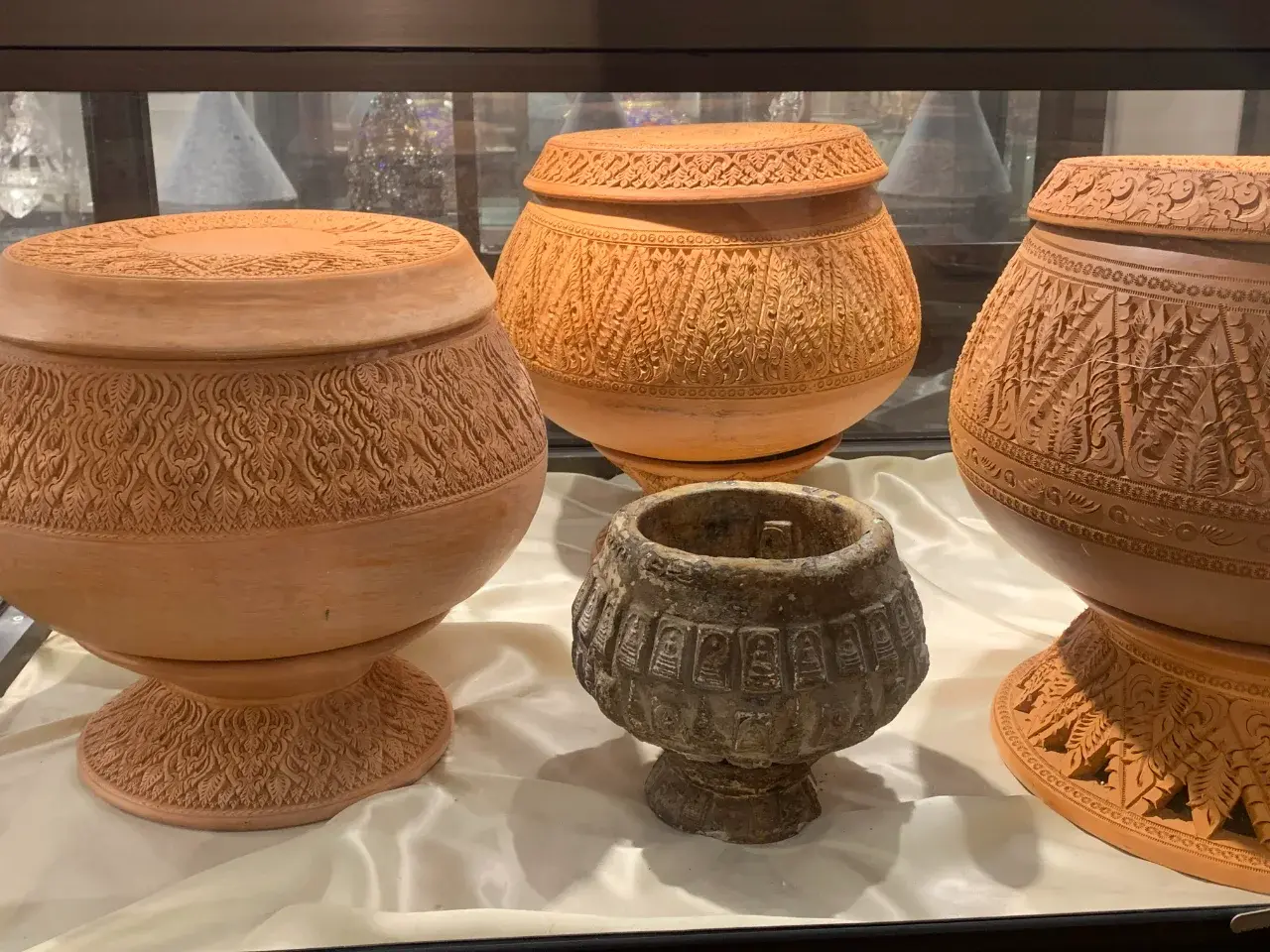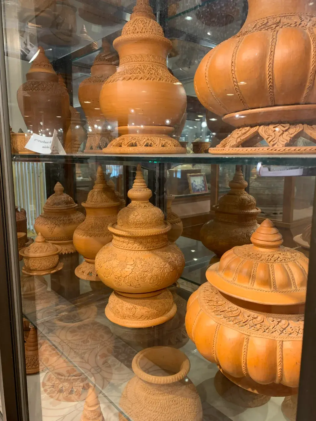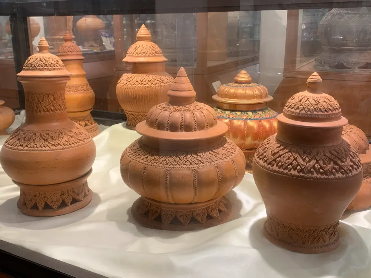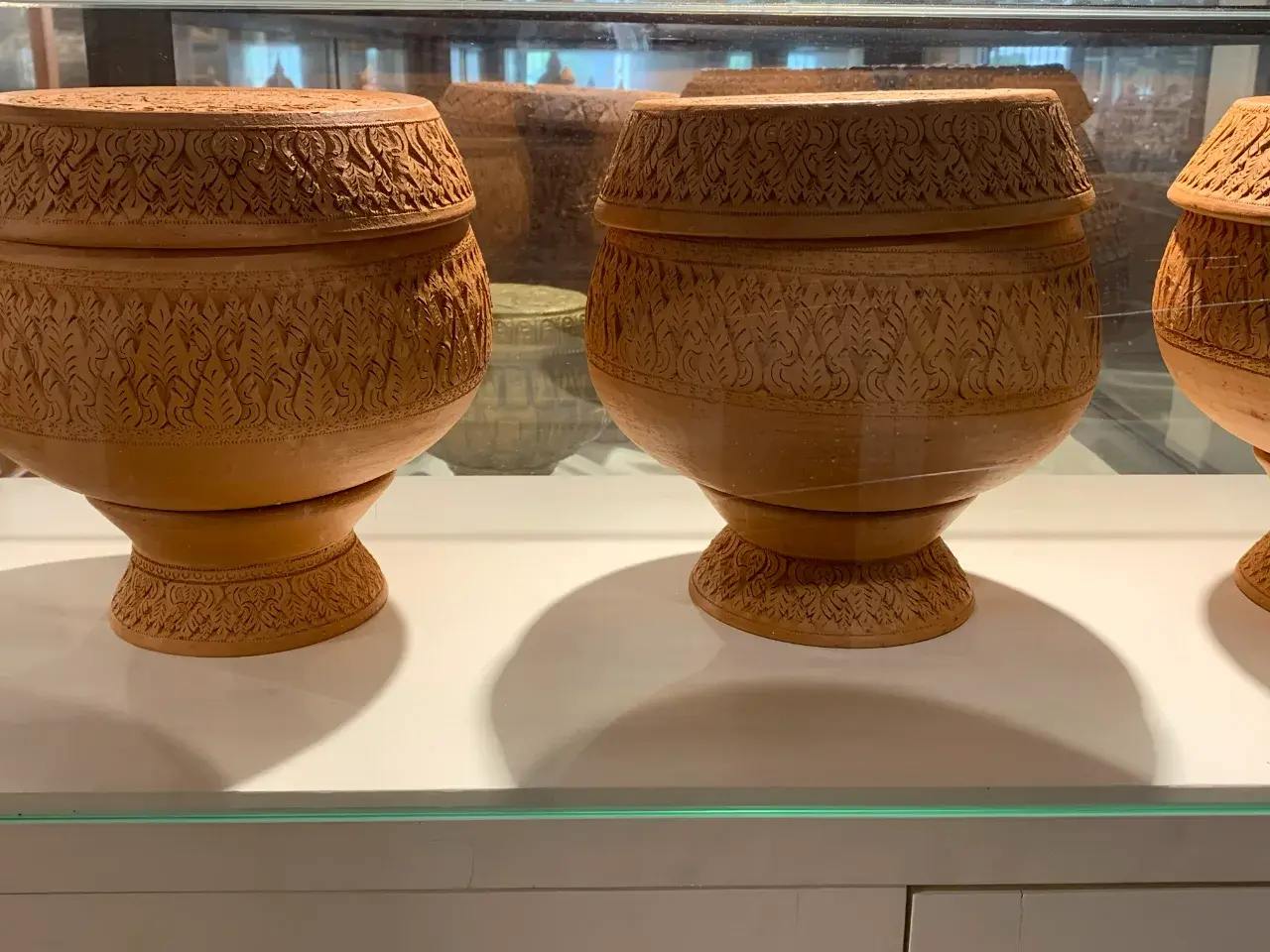 โดยในตู้กระจกจะมีการจัดแสดงบาตรดินเผา โถ ถ้วย ภาชนะ แจกัน เหยือกน้ำ ทั้งเก่าและใหม่ มีลวดลายเลียนแบบธรรมชาติแบบดั้งเดิม เช่น ลายดอกไม้ ลายบัวคว่ำ ลายบัวตั้ง โดยใช้เทคนิคการแกะสลัก ฉลุ เป็นต้น