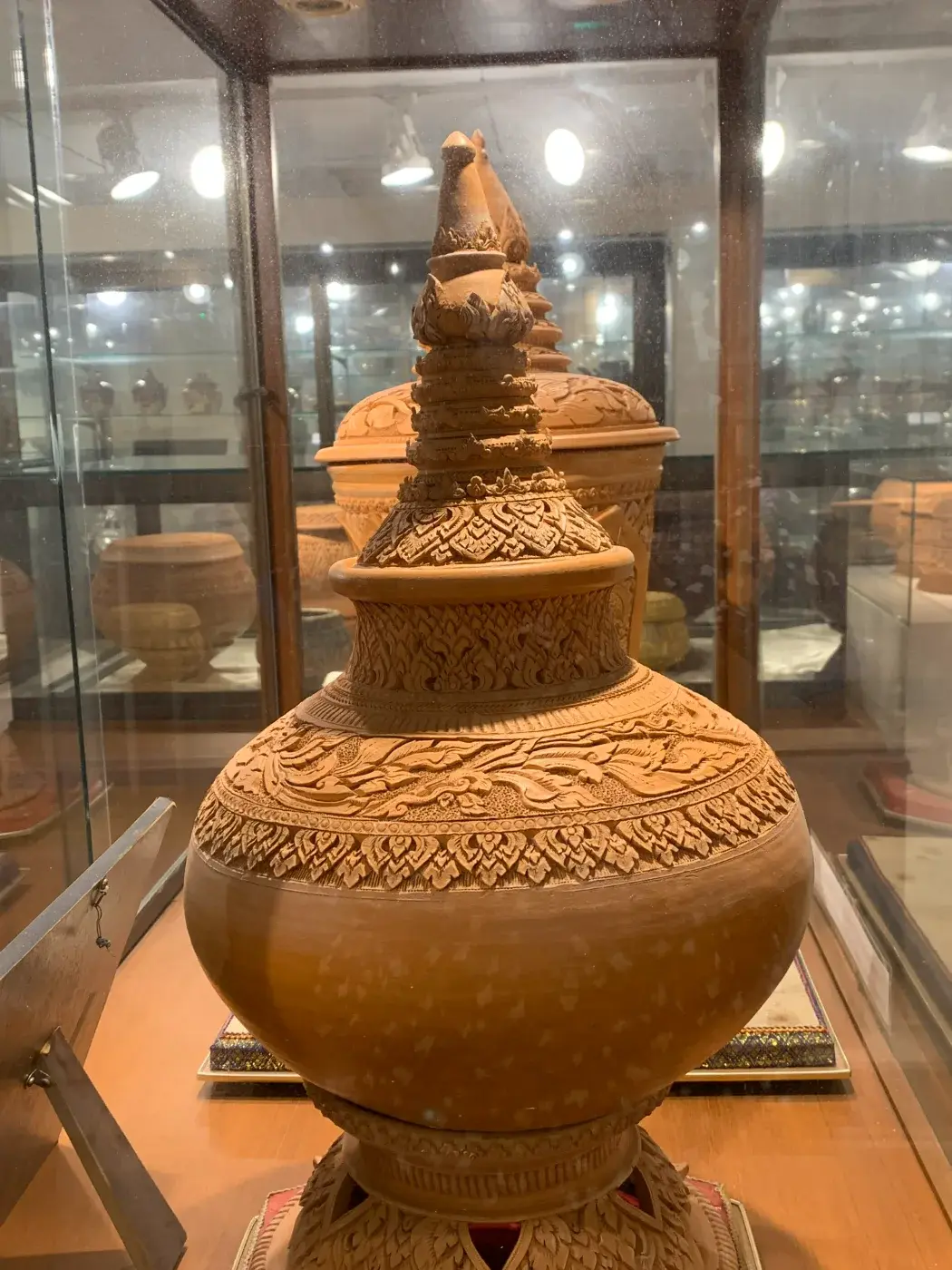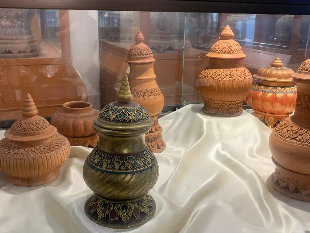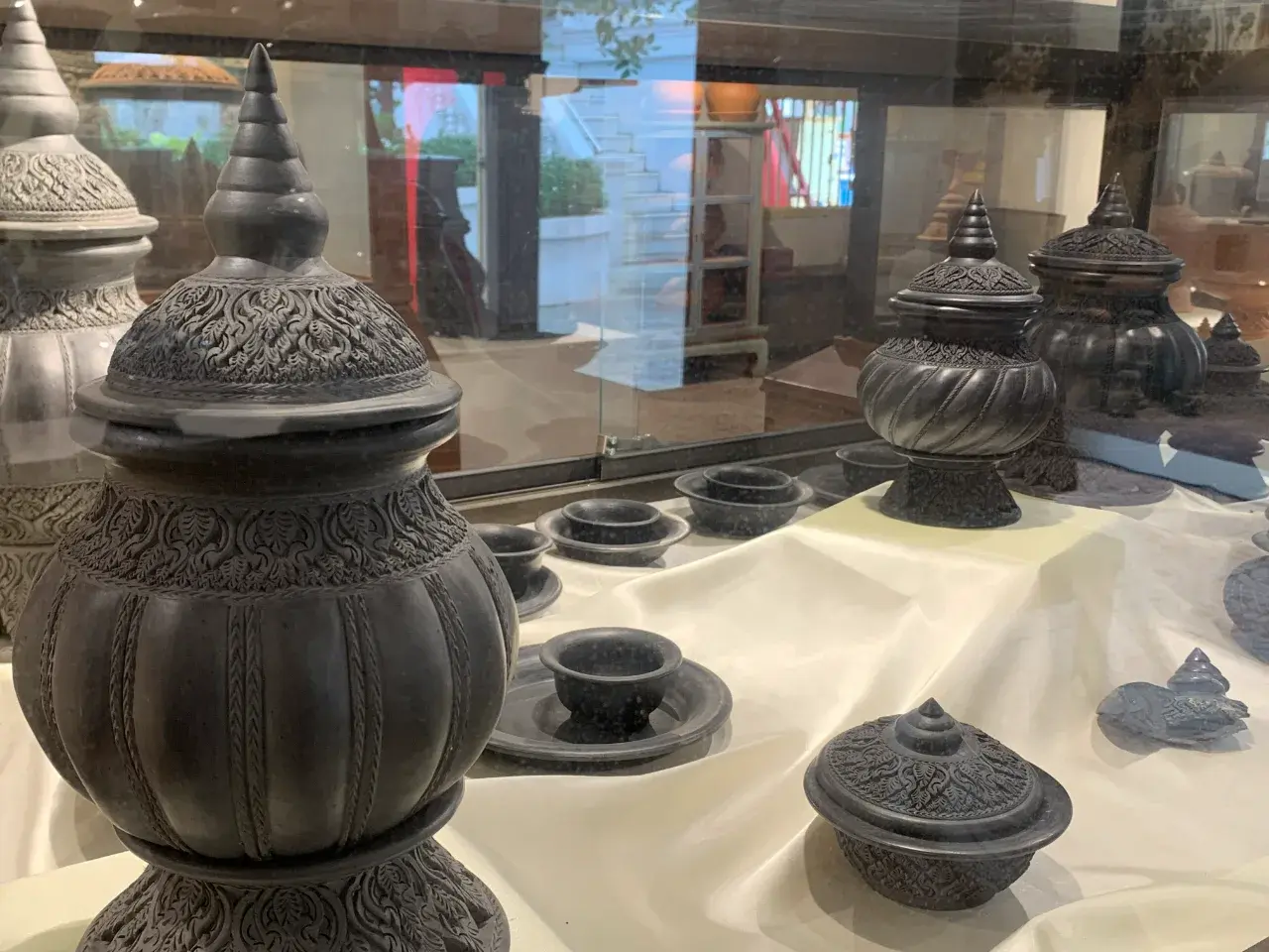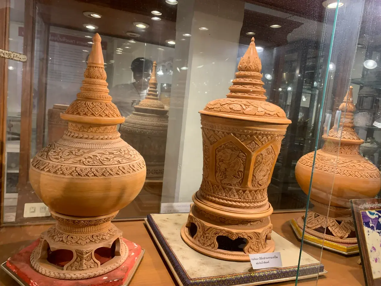 โดยในตู้กระจกจะมีการจัดแสดงบาตรดินเผา โถ ถ้วย ภาชนะ แจกัน เหยือกน้ำ ทั้งเก่าและใหม่ มีลวดลายเลียนแบบธรรมชาติแบบดั้งเดิม เช่น ลายดอกไม้ ลายบัวคว่ำ ลายบัวตั้ง โดยใช้เทคนิคการแกะสลัก ฉลุ เป็นต้น