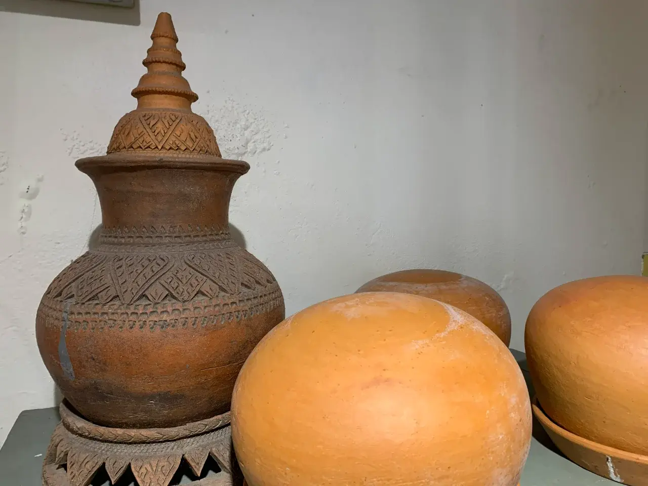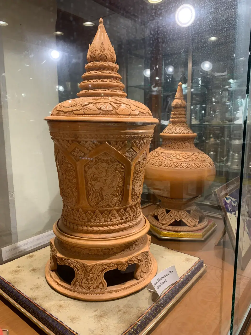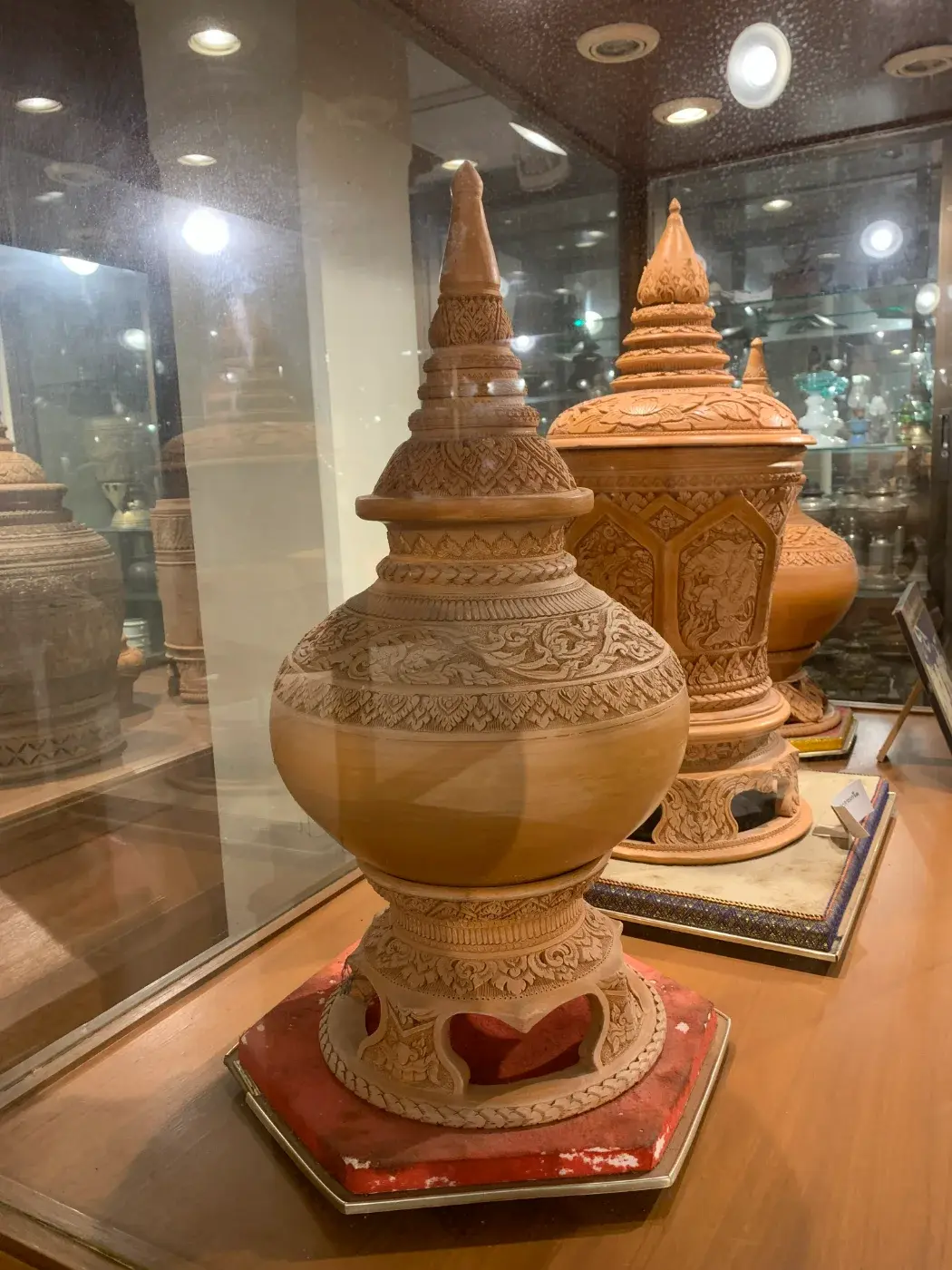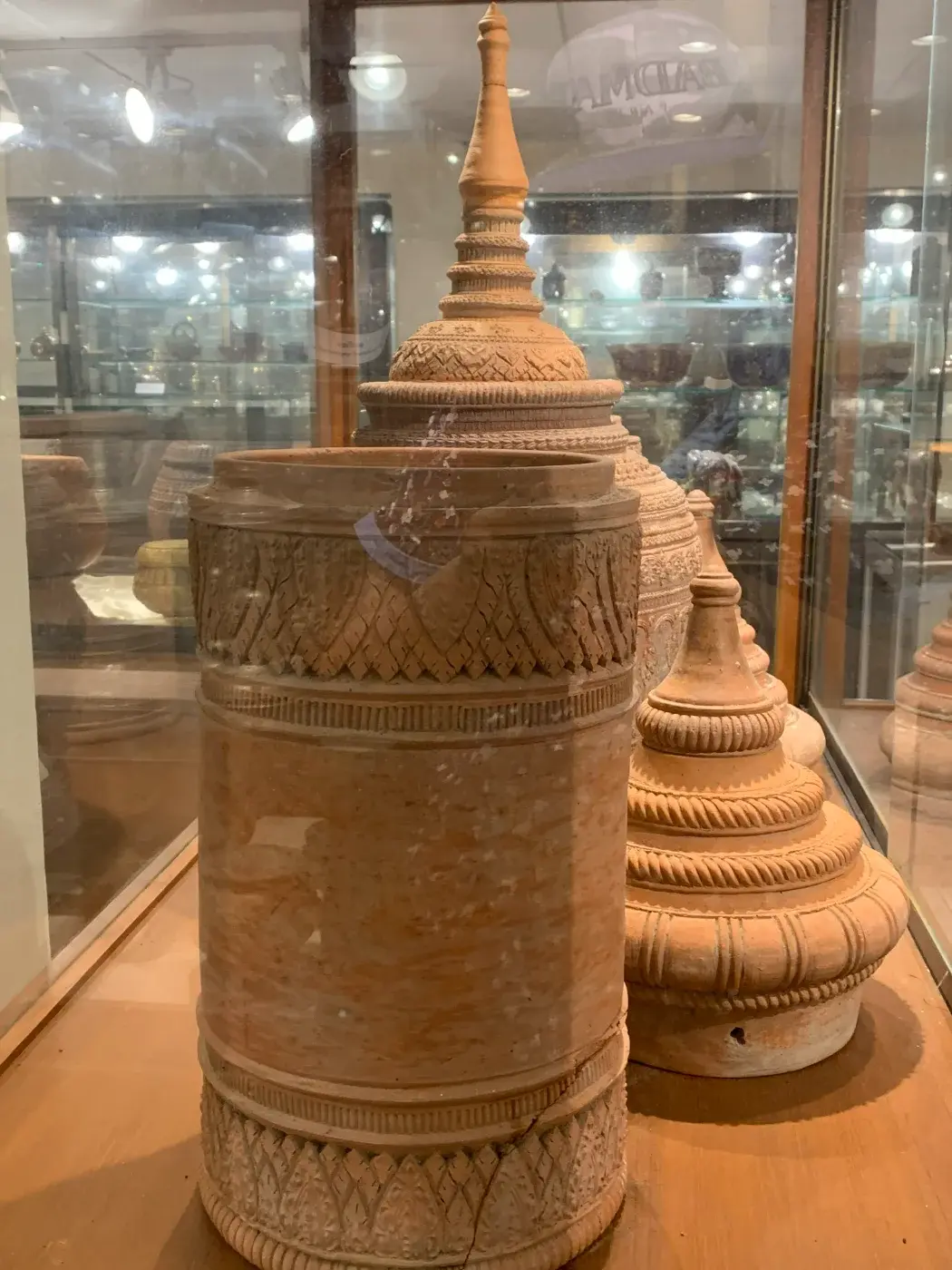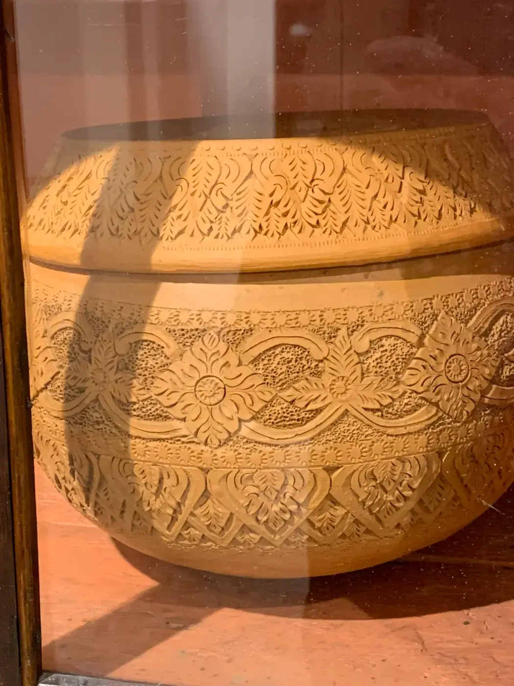 โดยในตู้กระจกจะมีการจัดแสดงบาตรดินเผา โถ ถ้วย ภาชนะ แจกัน เหยือกน้ำ ทั้งเก่าและใหม่ มีลวดลายเลียนแบบธรรมชาติแบบดั้งเดิม เช่น ลายดอกไม้ ลายบัวคว่ำ ลายบัวตั้ง โดยใช้เทคนิคการแกะสลัก ฉลุ เป็นต้น