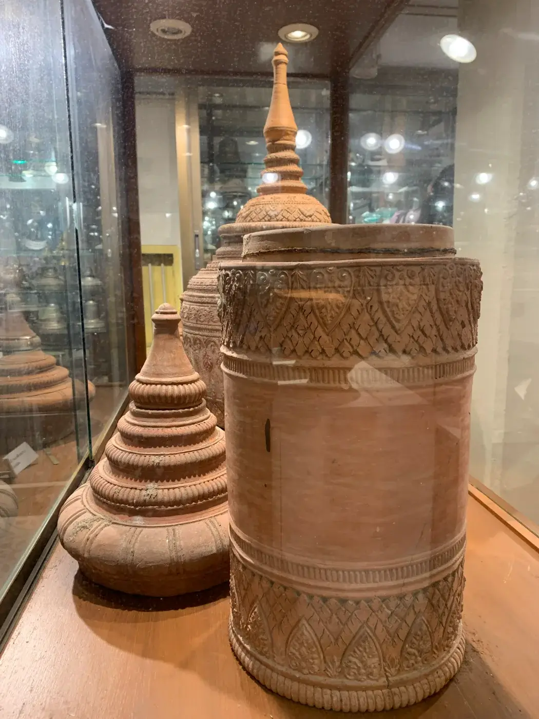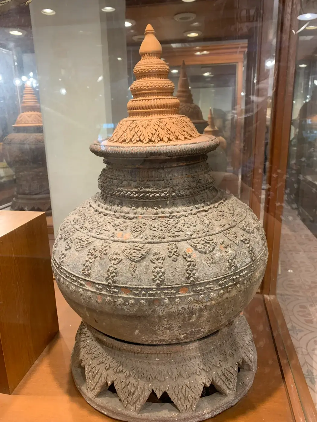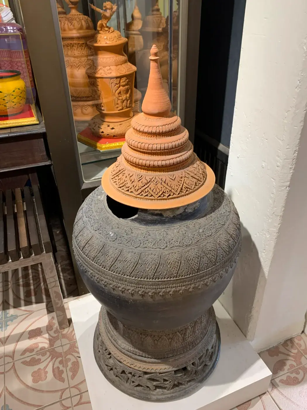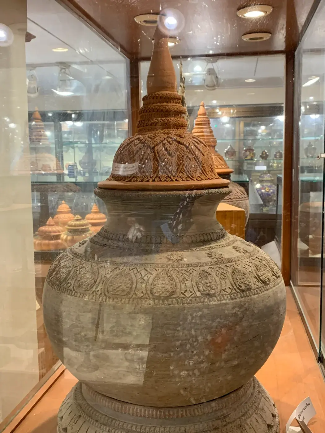 โดยในตู้กระจกจะมีการจัดแสดงบาตรดินเผา โถ ถ้วย ภาชนะ แจกัน เหยือกน้ำ ทั้งเก่าและใหม่ มีลวดลายเลียนแบบธรรมชาติแบบดั้งเดิม เช่น ลายดอกไม้ ลายบัวคว่ำ ลายบัวตั้ง โดยใช้เทคนิคการแกะสลัก ฉลุ เป็นต้น