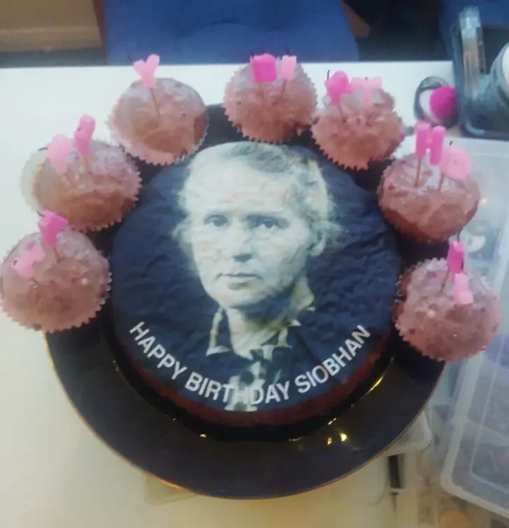 12. ลูกพี่ลูกน้องของฉันที่อังกฤษบอกกับเพื่อนร่วมงานว่าอยากได้เค้กวันเกิดรูปของมารายห์ แครี แต่พวกเขาเข้าใจผิด และนี่คือเค้กที่พวกเขาทำให้เธอแทน นั่นคือเค้กรูปของมารี กูรี