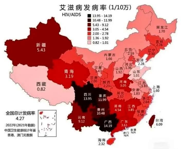 ในช่วงสัปดาห์ที่ผ่านมา โลกออนไลน์ของจีน 🇨🇳 กำลังแชร์ภาพ "แผนที่สัดส่วนประชากรติดเชื้อ HIV" ที่เผยให้เห็นข้อมูลเปรียบเทียบของแต่ละมณฑลทั่วประเทศ สร้างกระแสพูดถึงอย่างกว้างขวางทั้งใน Weibo และ Xiaohongshu โดยแผนที่ดังกล่าวแสดงอัตราผู้ติดเชื้อในรูปแบบ “จำนวนผู้ติดเชื้อต่อประชากร 100,000 คน” ซึ่งเป็นตัวเลขที่ใช้ประเมินความชุกของโรคในแต่ละพื้นที่