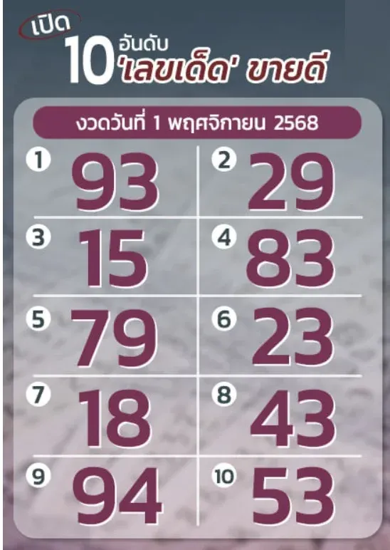 มาแล้ว! เปิด 10 อันดับเลขเด็ดขายดี งวดวันที่ 1 พฤศจิกายน 68..ส่องเลย พรุ่งนี้รวย!!