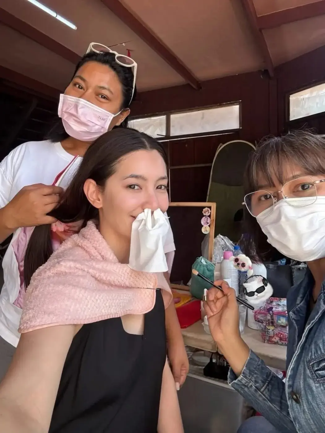 อย่างแรง เอาทิชชู่อุดจมูกให้ช่างหน้าผมแต่งองค์ไป (สภาพ..) ไปเข้าฉากก็ใส่มาส์ก แต่พอเห็นพระเอกหลับเท่านั้นแหละ จิตวิญญาณนักข่าวสาวต้องเก็บภาพมาฝากท่านผู้ชม อ่ะ ตอนเช้าถ่ายจบไป ก็พักกลางวัน