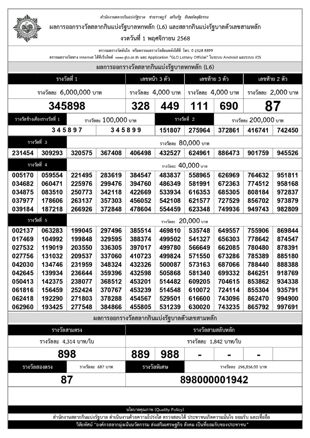 ผลการออกรางวัลสลากกินแบ่งรัฐบาล งวดประจำวันที่ 1 พฤศจิกายน 2568