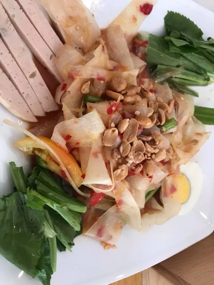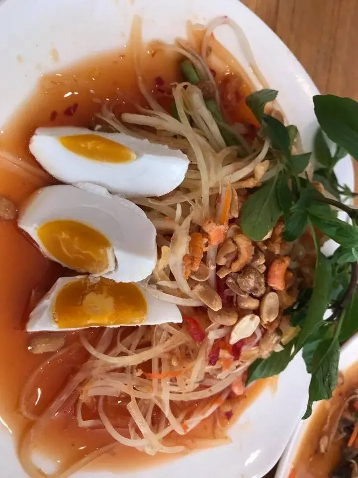 ตำไทยไช่เค็มที่บ้านเรานั้นเรียก แต่ที่นี่นั้นพอเราชิมเหมือนคนที่นี่ตำแต่ว่าอร่อยเหมือนกัน สีและรสชาติมันไม่ค่อยใช่ แต่ทานได้เหมือนกันดีกว่าทานส้มของที่นี่ ถือว่าอร่อย คนเรานั้นอาหารที่อร่อยไม่แตกต่างกันมากบางครั้งเปรี้ยวหวานคืออาหารที่ชอบ แต่มากกว่าเปรี้ยวหวานคือสำหรับคนที่ทานอาหารเผ็ดได้ เราจึงเลือกที่จะมาทานในส่วนของอาหารประเภทนี้