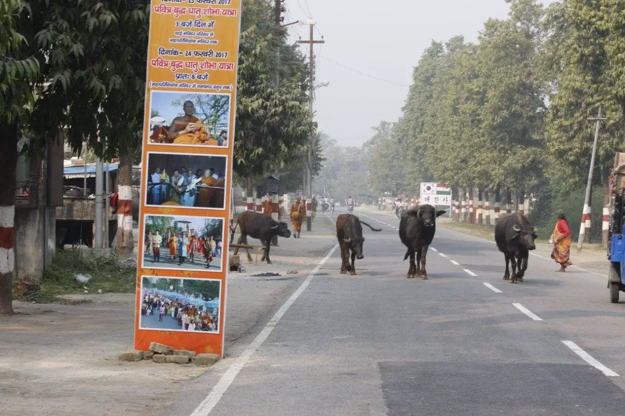 นอกจากว่าควายเดินแล้ว ยังมีอีกอย่างคือพระสงฆ์บิณฑบาต พร้อมกันเลย เดินสวนทางกัน อิสระมากเจ้าควาย ตอนนี้นั้นจะไม่ค่อยที่จะมีรถเลย มีบ้างก็เป็นรถในการที่จะตามควาย รถอื่นไม่มี ยังไม่ได้ตื่นกันหรือไม่ แต่ทำไมควายตื่นก่อน เรานั้นไม่ได้ดูว่าควายนั้นจะไปไหนน คงไปกินหญ้า แต่ว่าระหว่างทางทำไมควายดีจังไม่แวะในการทานอาหาร หรือกินหญ้าหรือว่าจะลงไปในนาข้าวไม่มีเลย เดินตรงไปอย่างเดียว