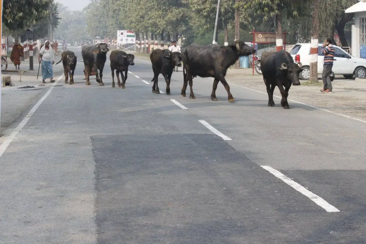 ในยามเช้านั้นเราจะเห็นว่าถนนนี้จะมีหลากหลายอย่างที่เดินผ่านมา เช้าก่อนเลยจะเป็นในส่วนของเจ้าสี่เท้าอย่างควายเดินกันออกมาเป็นฝูง ไล่เลี่ยกันแต่ว่าไม่มีเจ้าของ เพราะว่าเหมือนว่าควายนั้นจะเดินทุกวัน เดินไปในสถานที่ในการกินหญ้าของตน สามารถที่จะข้ามถนนไปเลย ยึดเลยถนนสายนี้ ไม่นานเขานั้นเดินผ่านไป สงสัยเหมือนกันว่าไม่มีคนเลี้ยงหรือ ควายเลี้ยงกันเองไหม
